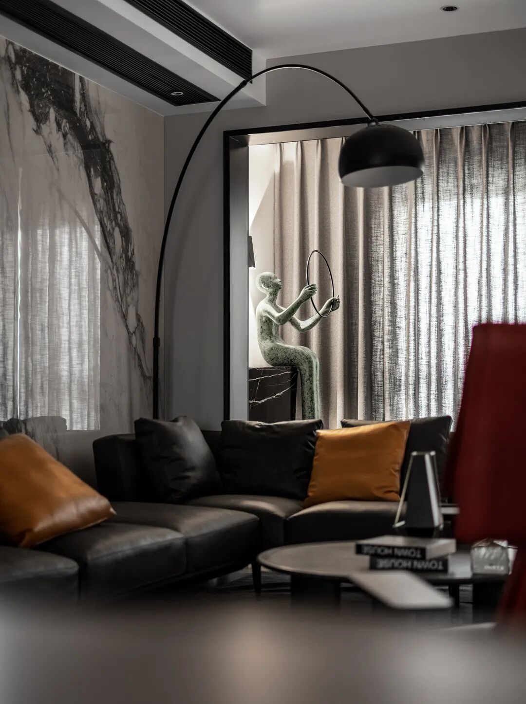 项目介绍 | 从简去繁,去伪存真,简约到极致,追求感官上强调素净 整洁 品味 思想上注重优雅与格调,如果说客厅与餐厅是横向的连贯,那么客厅与书房之间就是纵向的穿梭很好地体现了,空间设计的流动性、空间的自然漫步,让家实现了空间与情感的连接达致心灵共鸣,大地深灰结合空间光影的雕刻感很好地表现出光的两面性,阳光、石材、木质、皮料、灯具的统一性,得到很好的融合。