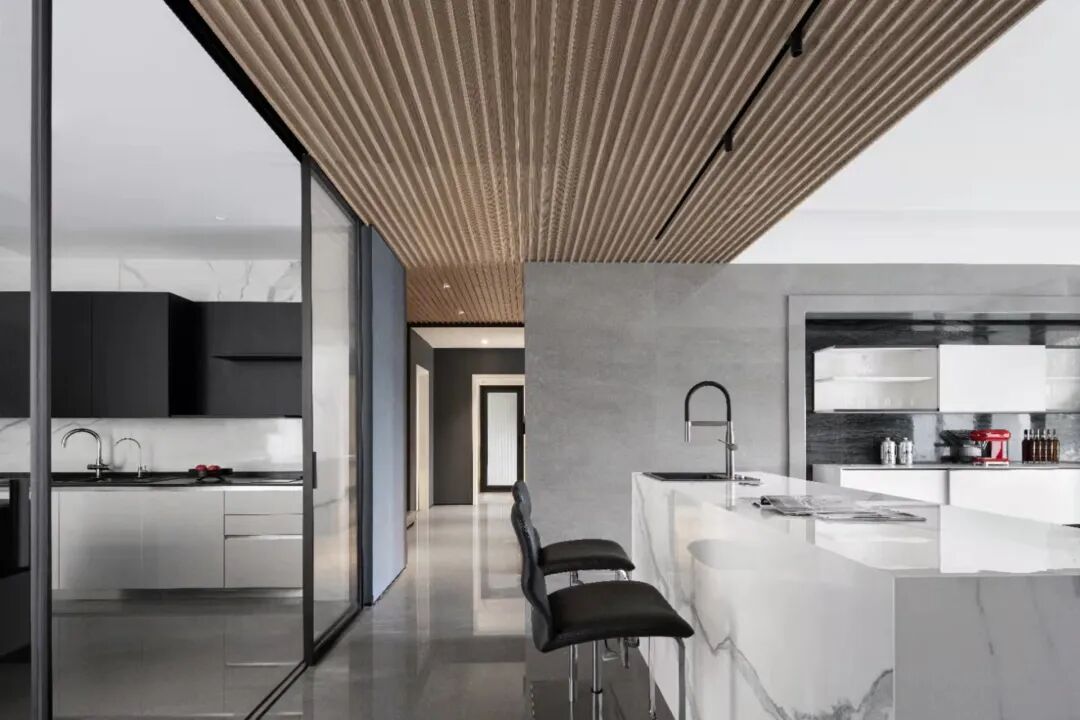 项目介绍 | 简单的生活方式,安宁静谧,干净而纯粹,他希望他的住宅是脱离神性的设计,不过度追求运用设计语言,只要求他回归原始的私宅属性,他将“简”与“奢”两种看似矛盾的元素融合在一起,并且运用不同的天然石材讲故事,一步步让人沦陷。