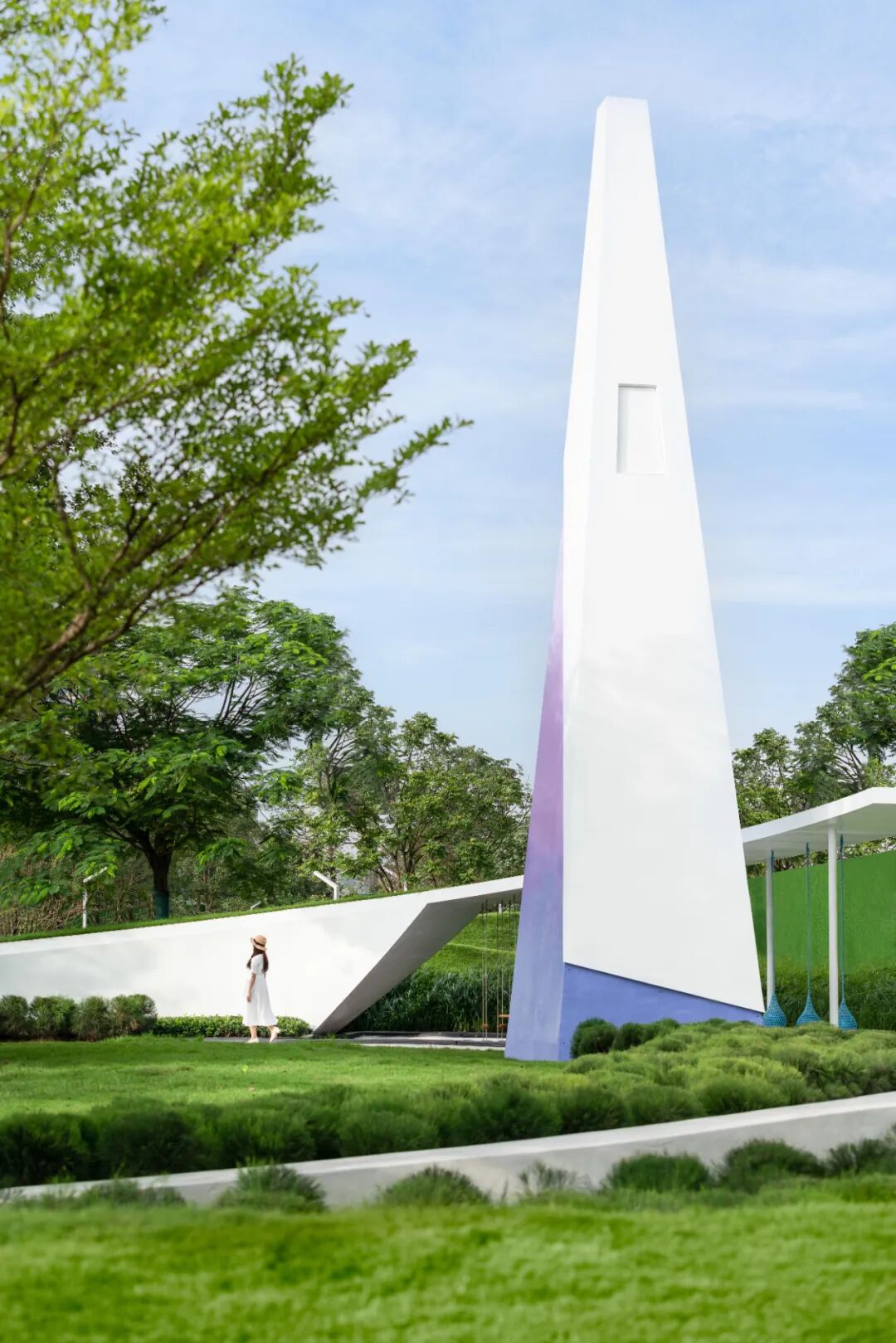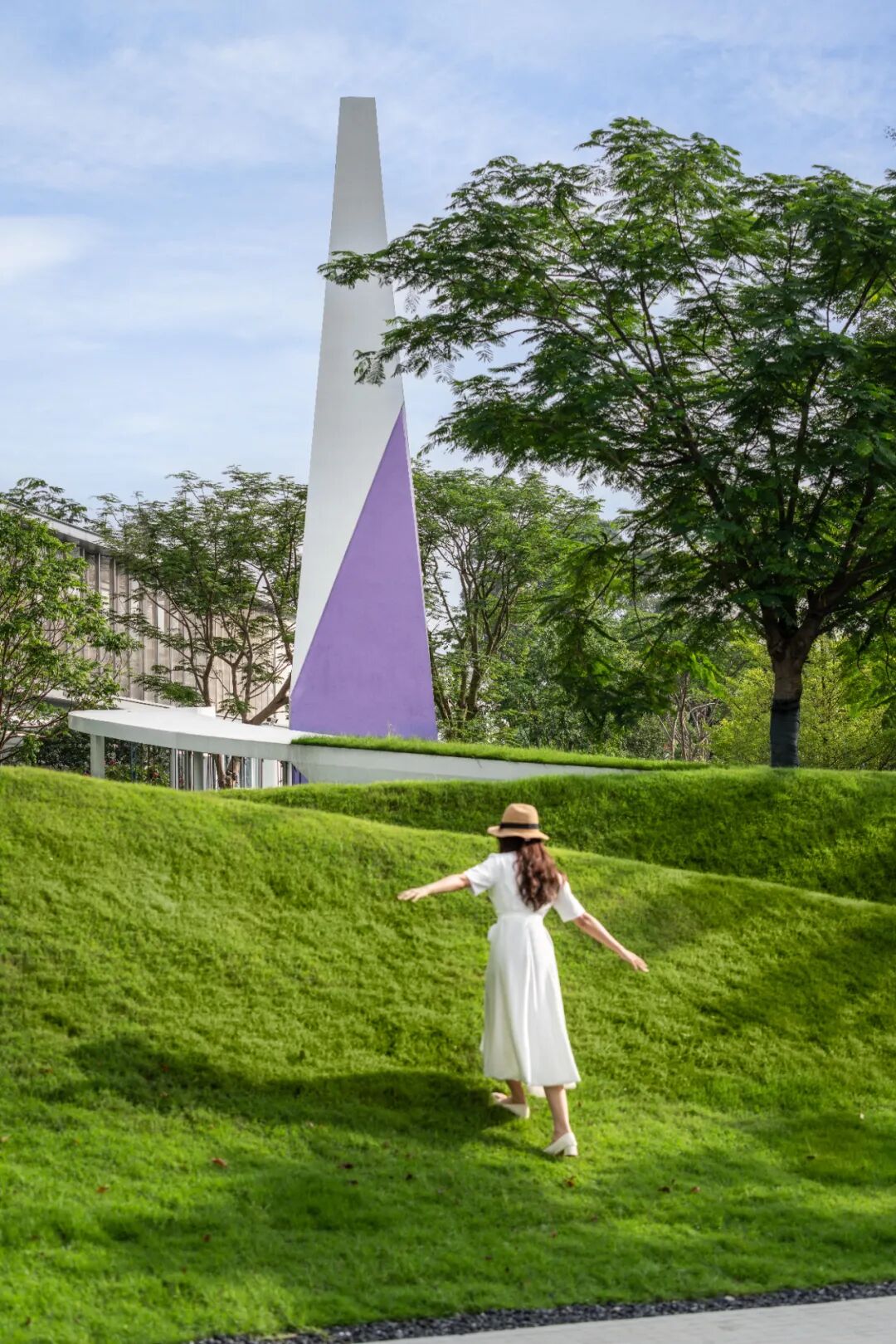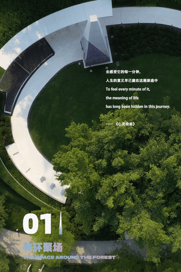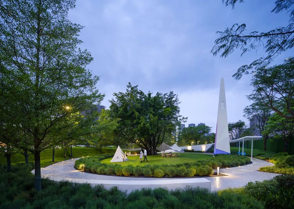 在入场之时,夹道的树林引导着前方,草坡、高耸的白塔等新奇元素,为入境之前做足了铺垫。围绕榕树的步行轨迹,让场景慢慢充满了戏剧的感官体验。