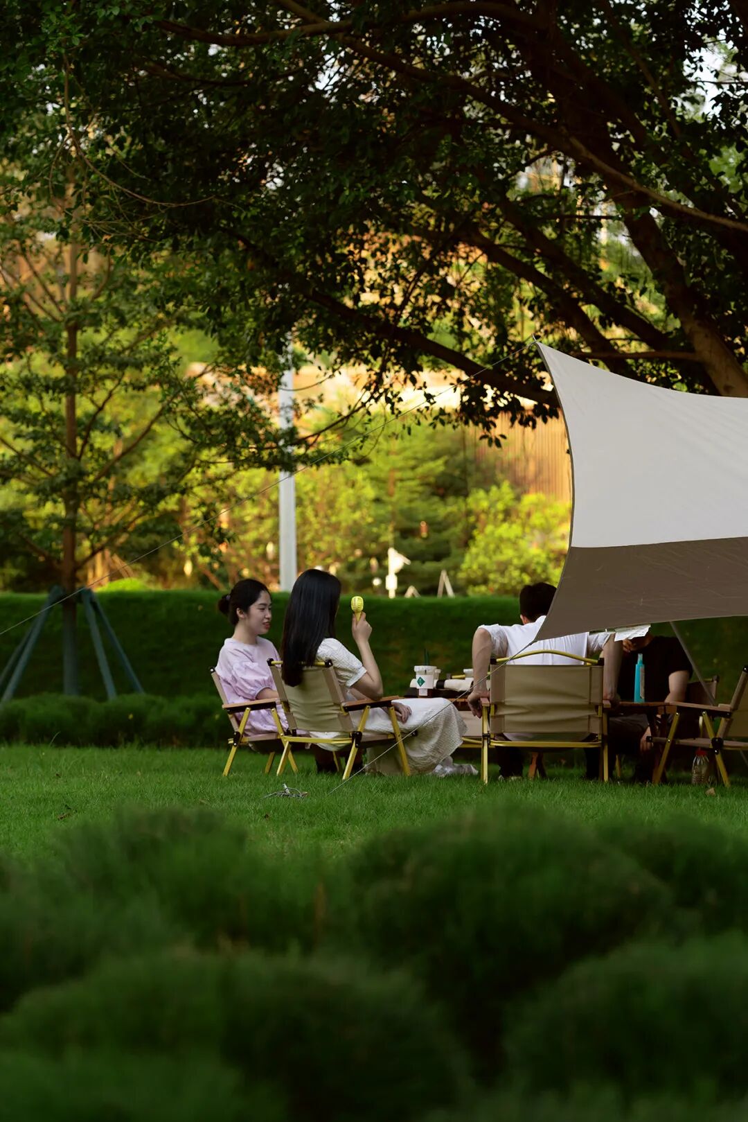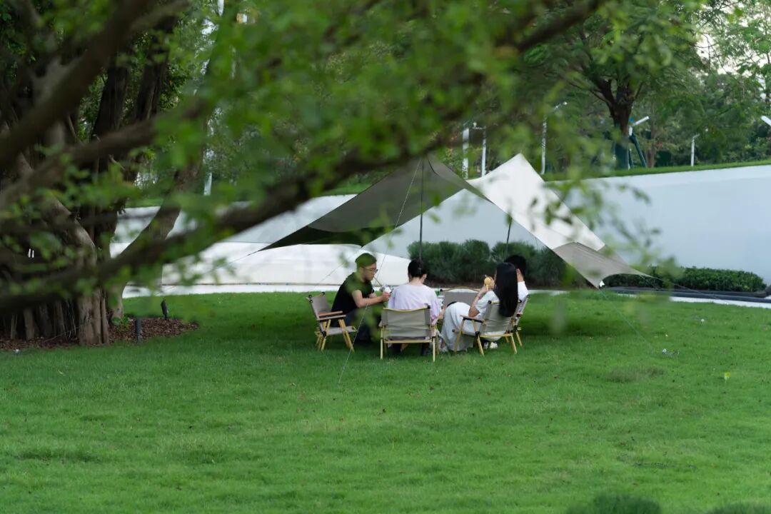 在大地艺术下的绿洲空间,生长出各类户外活动,或是林间或是树下,以草坡为背景,chill的氛围无处不在。