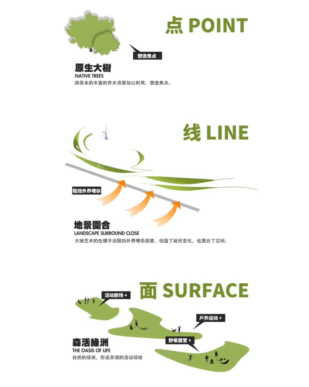 设计之初,场地周围诸多嘈杂不利因素,如何化解原生乔木与商业的矛盾,改善原生环境;弱化周边消极界面;重塑社区蔓延城市绿地系统,提升公共性城市界面成为重点。首先设计希望通过艺术化的地形弱化外部消极的环境界面及噪音的影响,提供安全舒适的内部休息性空间;通过点线面的设计策略塑造空间的变化。