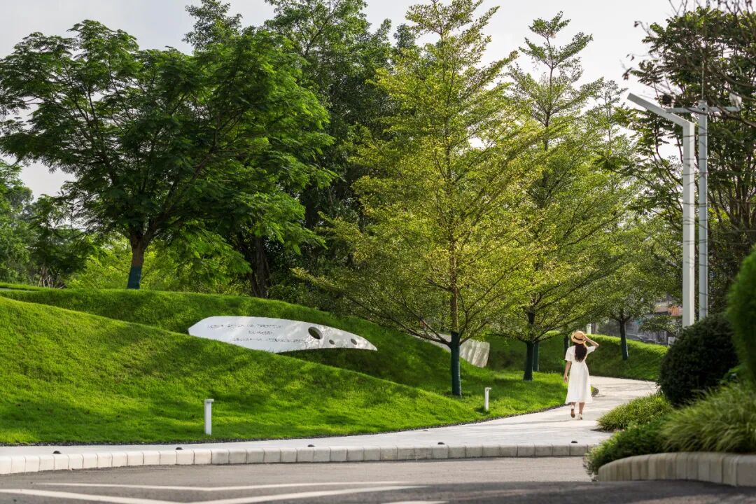在公园的设计中,我们整体有意将场景划分出舒展的弧度,以大地艺术的手法,通过起伏的草地绿岛和道路树木有机结合,形成充满灵动变化的公园空间。在平行视角上,身处其中,每个角度营造出横看成岭侧成峰的变化场景,引导着场景参观动线的方向。功能上,临近街道也形成充分的围合,也规避了周边不利因素的影响。在立面上也营造出虚实的透景效果。