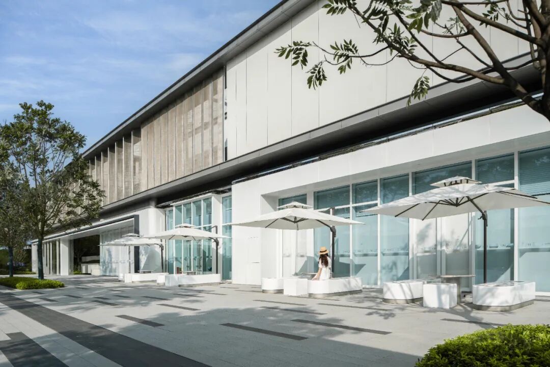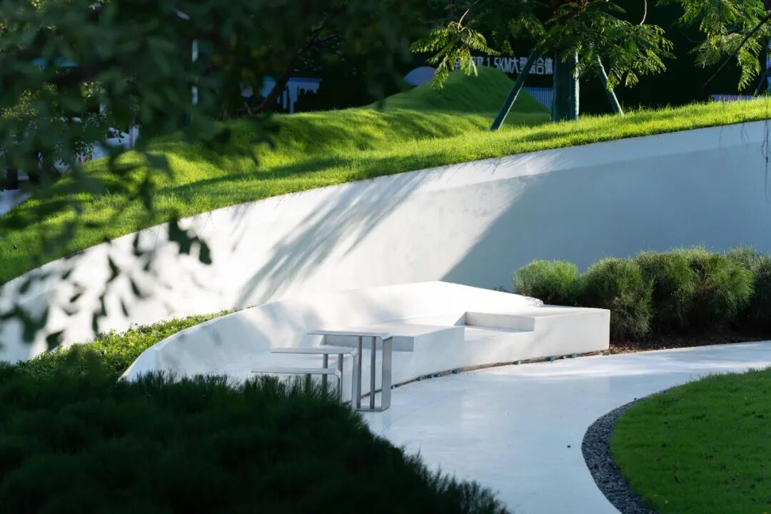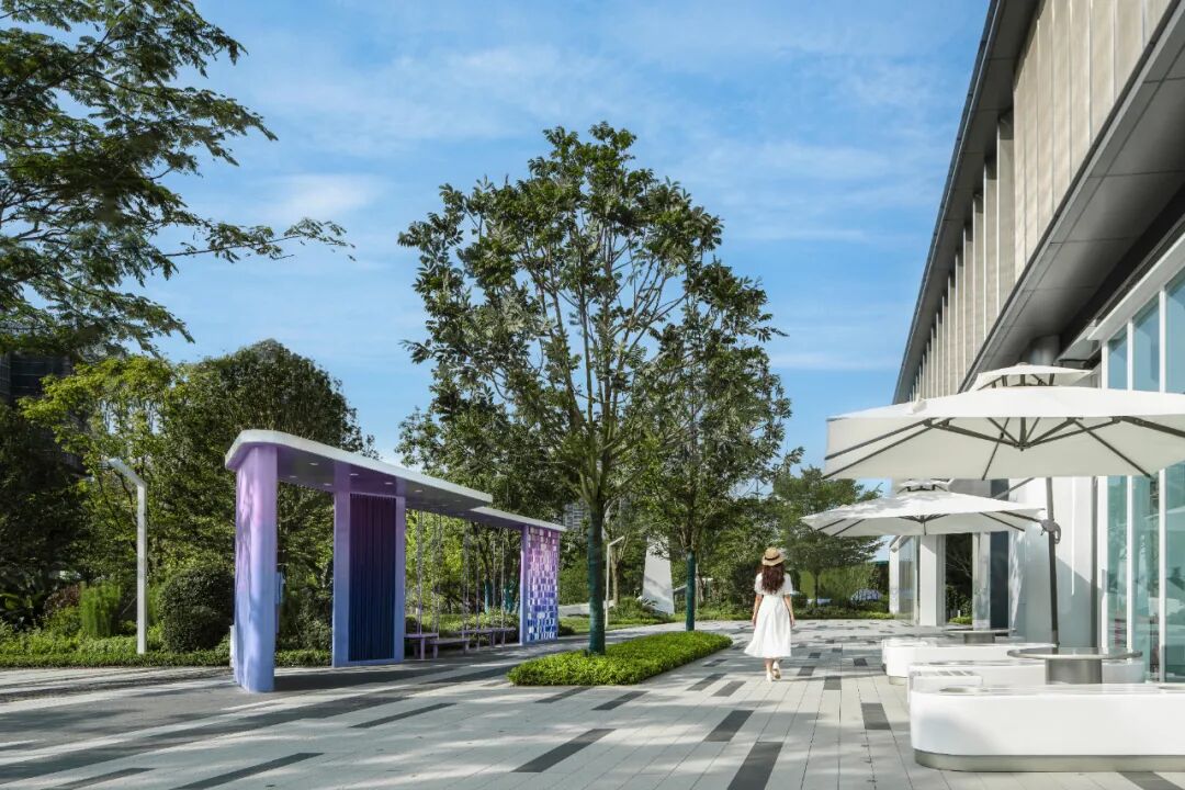 整体街道构建出沉浸式场景,灰白的铺装与白色景观软装营造清爽干净的休闲街区。也为后续的商业布局预留的活动空间。