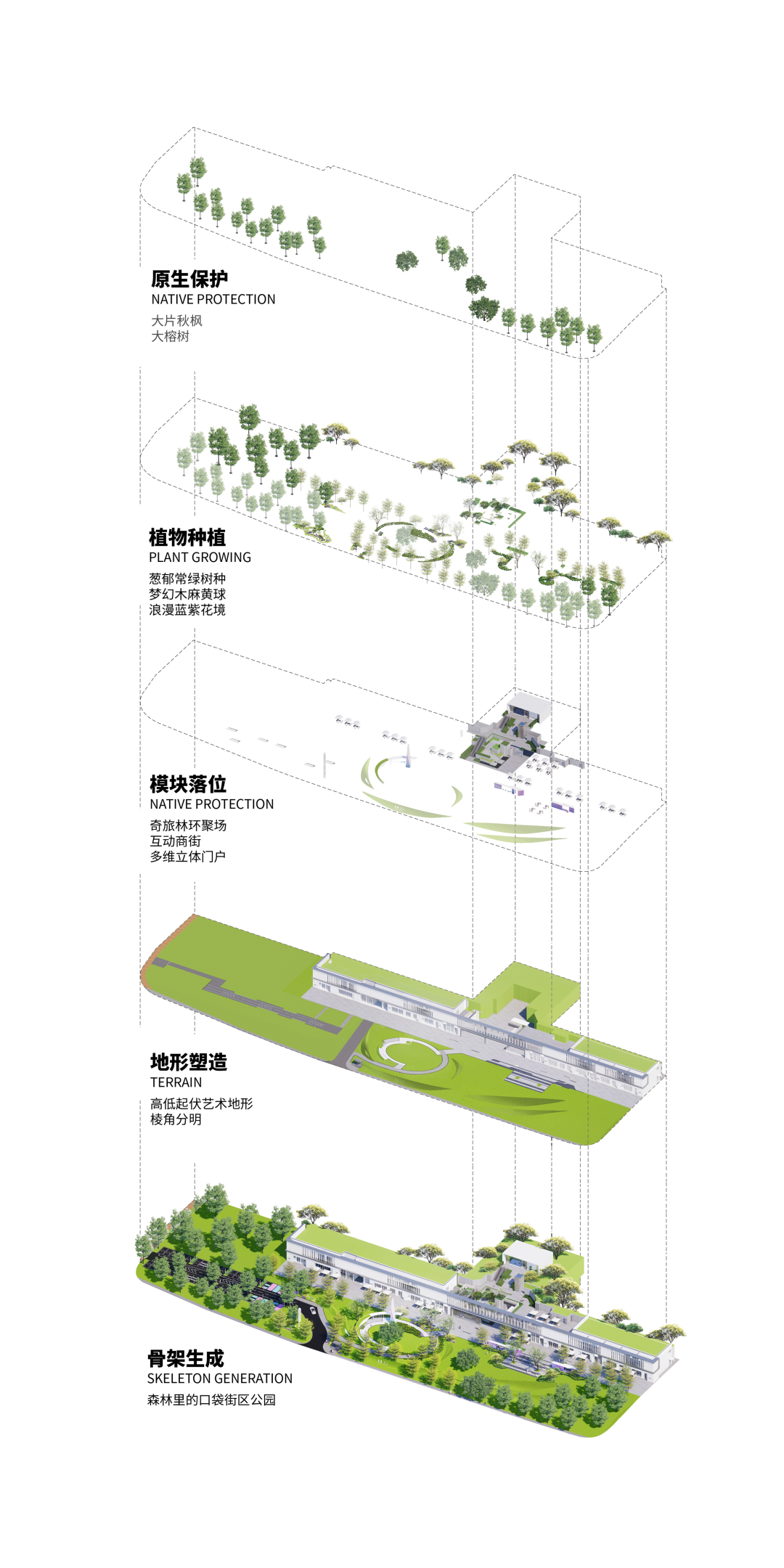 A good life block park must return to the integration of the living environment. In the final returned living area, the 8M height difference of the project itself is used to create a smart and varied path home. Looking for the ladder, between the steps, here to build the three-dimensional forest domain of the heart of life.