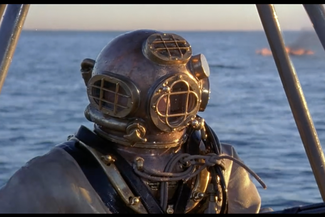 不过1950年代还没有饱和潜水这个概念,他们在电影里穿上近200斤重的潜水装备,接上供气管和通讯线就直接下水作业了。
