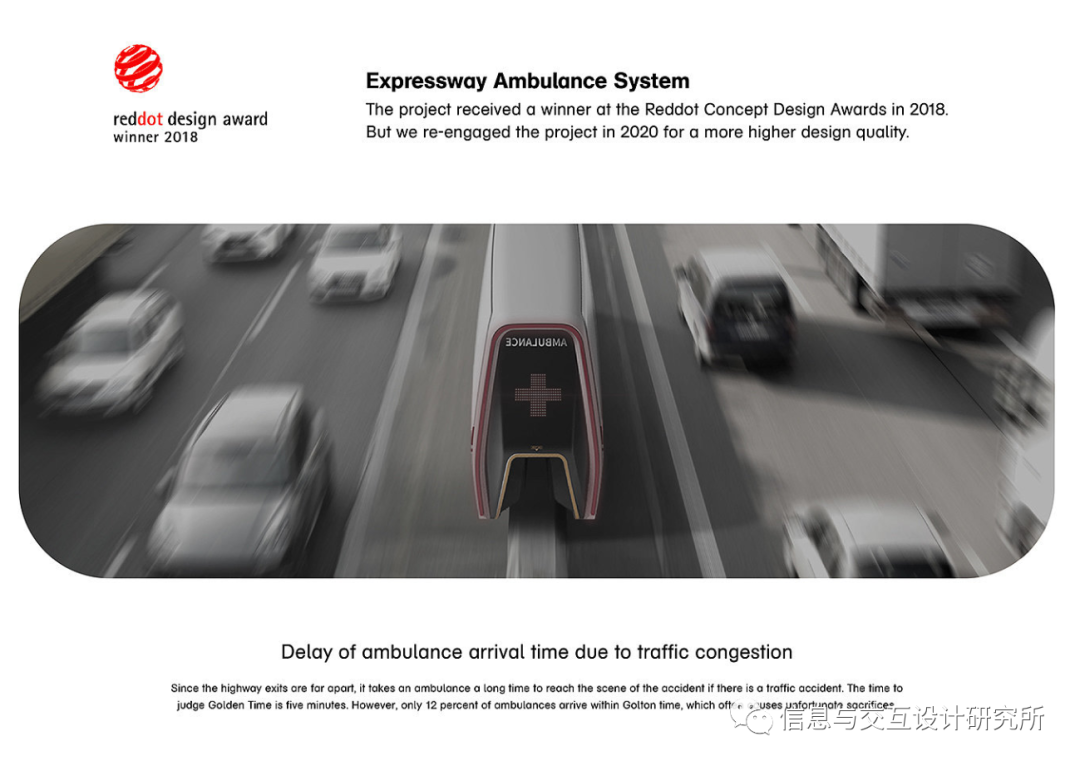 响应高速公路交通事故的 Median救护车概念。由于地理位置的原因,与标准道路相比,道路上更容易发生严重的伤亡事故,但是一旦发生交通堵塞,救护车就很难准时到达。这款概念救护车被设计成使用高速公路的媒体带,这样,它就可以快速到达,而不需要停下来来节省最关键的一分钟。AMB行驶的轨道为中位带,无论交通状况如何,均可快速到达事故现场进行救援。它返回收费站,把病人转到等候的救护车上。这是一个智能系统,病人可以迅速去医院接受进一步的治疗。