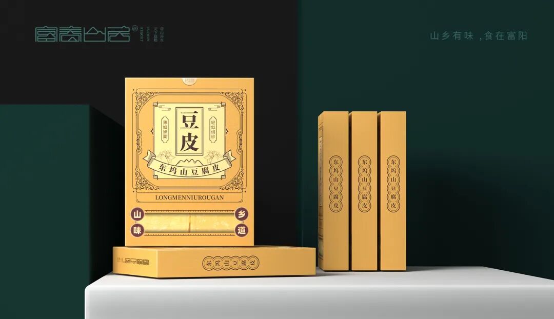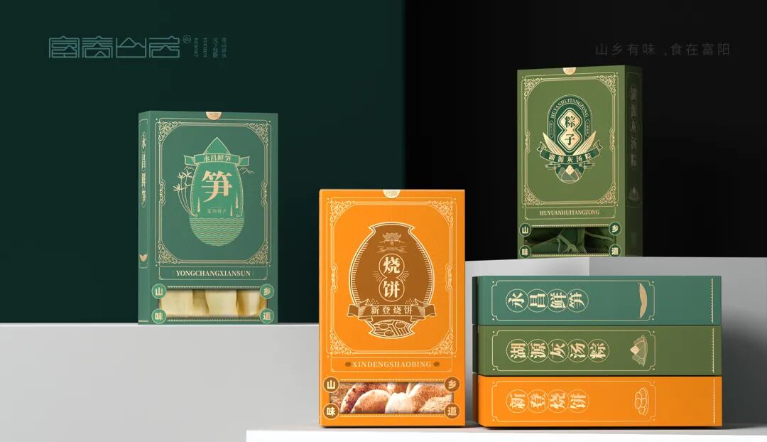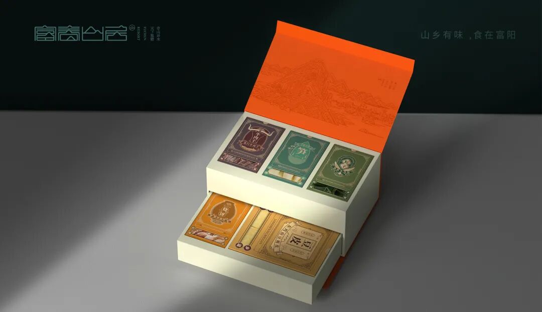 把富阳五款极具代表的农特产品集盒一起,赋予每款产品兼具产品特色和古典美学的包装。并以图形图标的形式,把产品元素、建筑和文字形成一套具象化、可视化的富阳专属美食礼包。