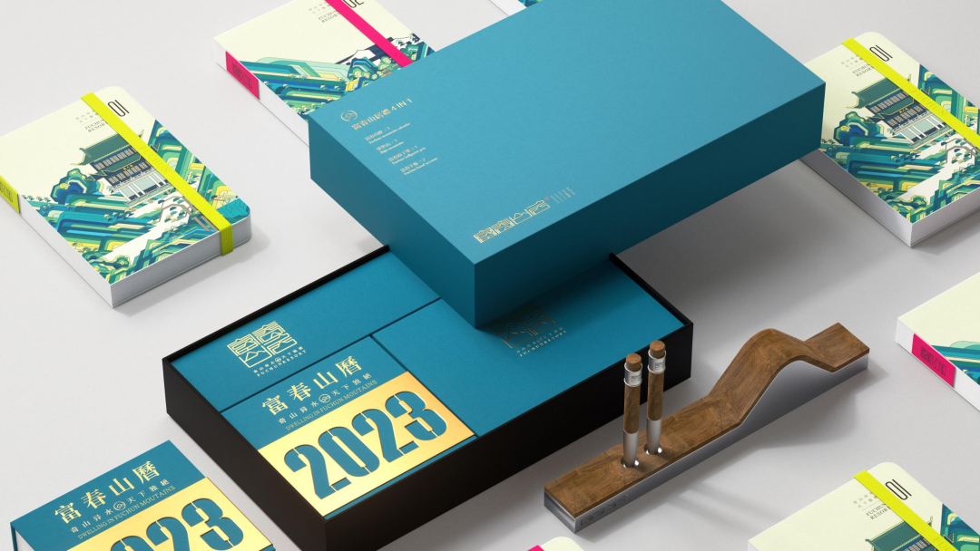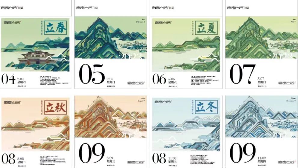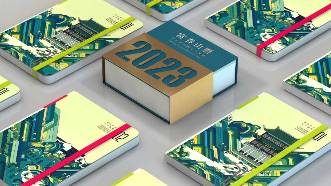 山历内页通过24节气将画面进行了四种色彩的区分,笔架造型取自富春山居品牌识别系统中的辅助图形,实现通过产品输出品牌视觉。