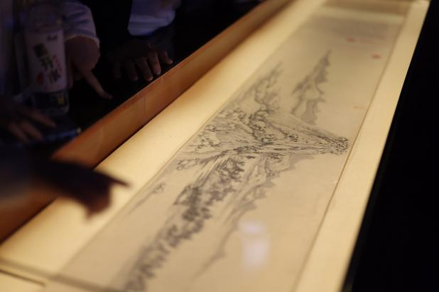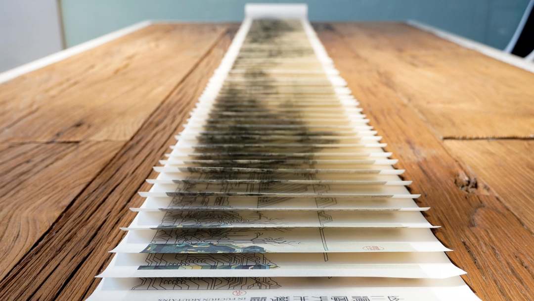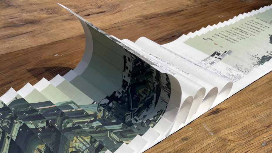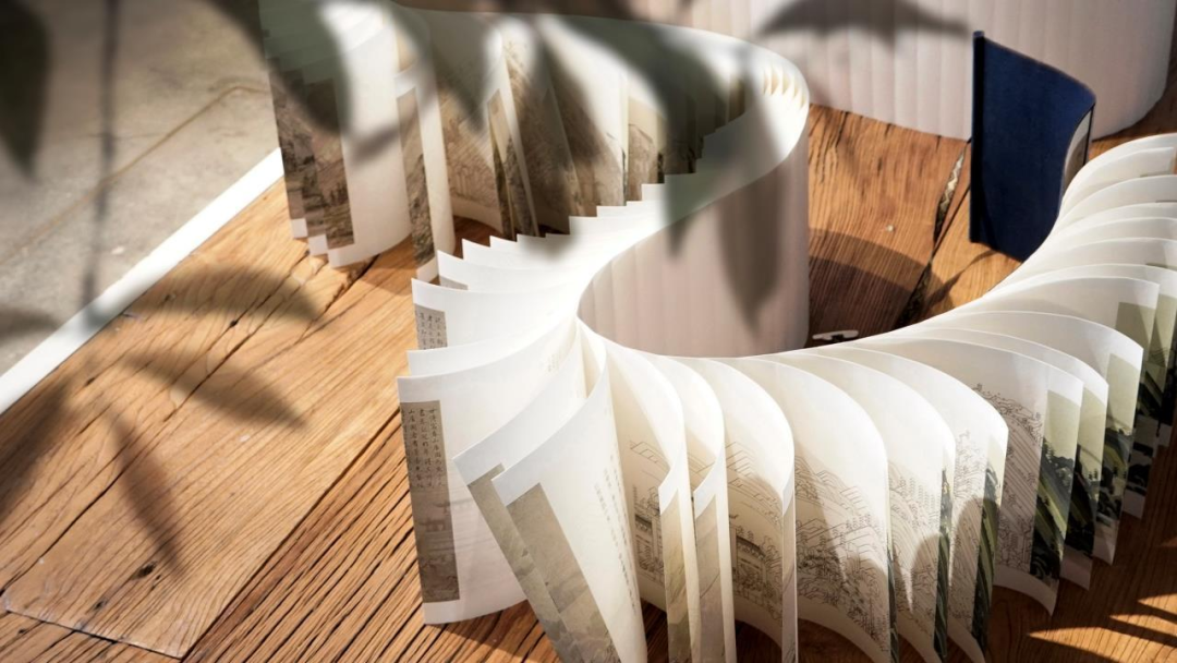 龙鳞装富春山居图正反面由264片龙鳞组合,卷轴从右向左展开,首先呈现现代版富春山居图,通过龙鳞页翻页展示富春山居图原图画面。