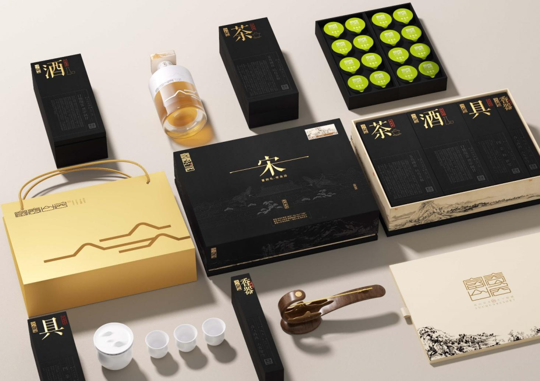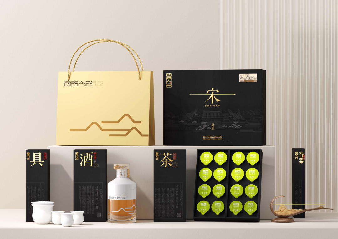 礼盒内富春山小罐茶、山居吟线、场口土烧酒以及山水玲珑茶具四套物品传达了富春山居生活图景里最为有特点的“茶、香、酒”部分,包装也以简洁的线条画面传递了宋韵文化古朴典雅的美学意境。