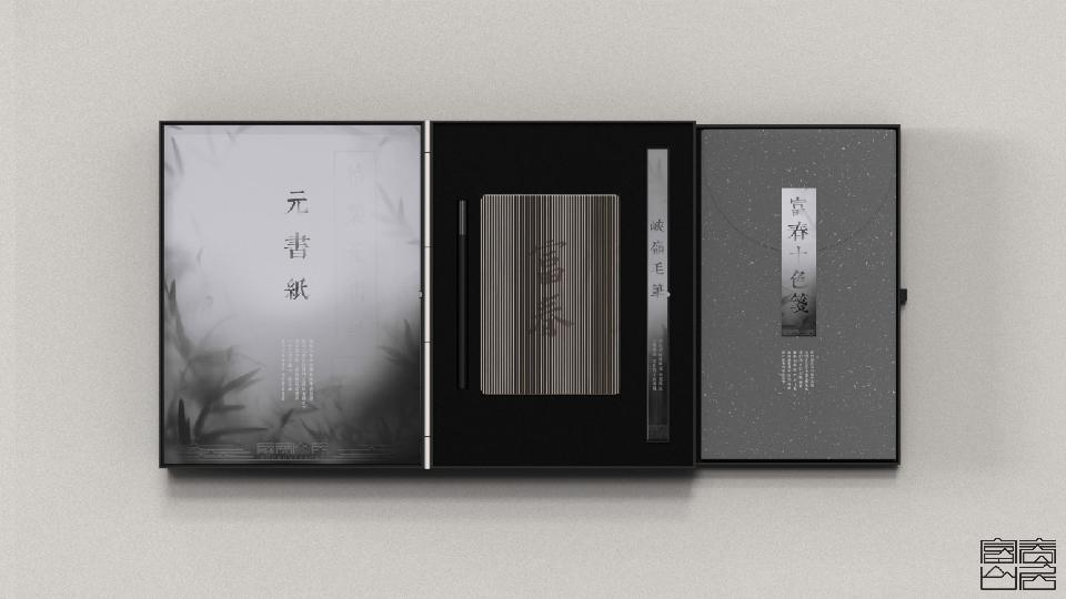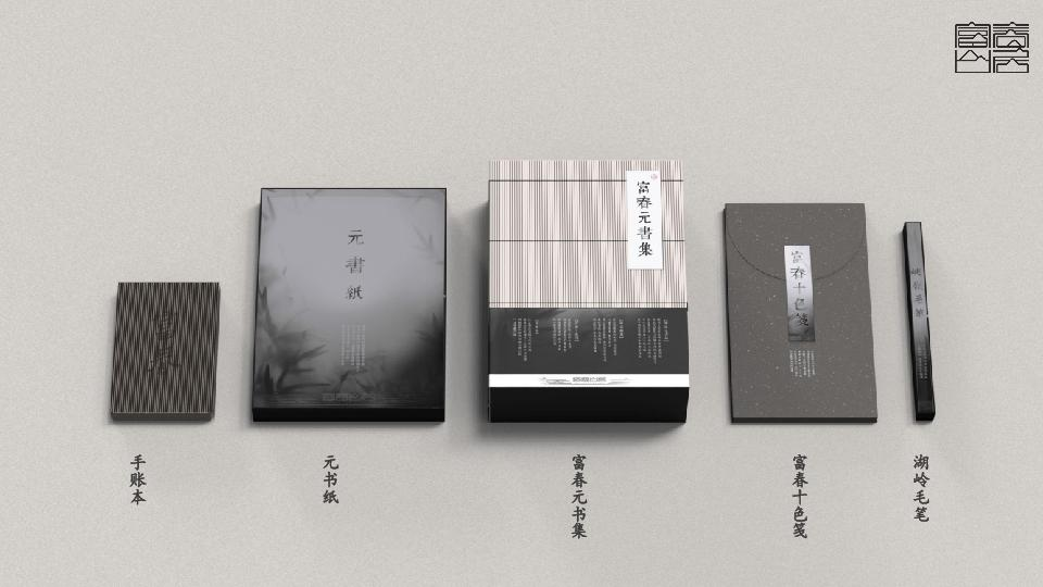 寓意考取状元的元书纸和湖岭毛笔,传达文雅之气的十色笺和自在富春手账本——后者通过光栅立体画面的交互设计将『自在』隐藏于『富春』之中,暗含对自我的内观之意。
