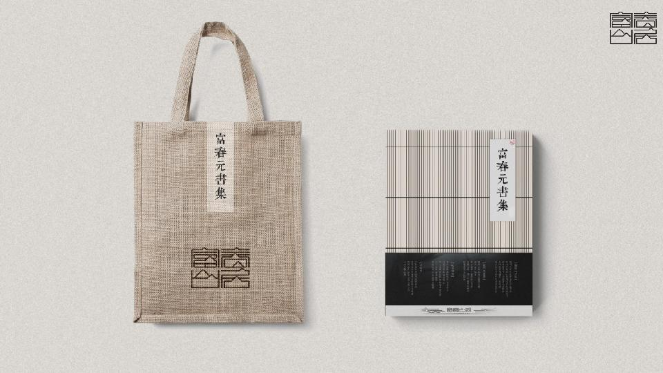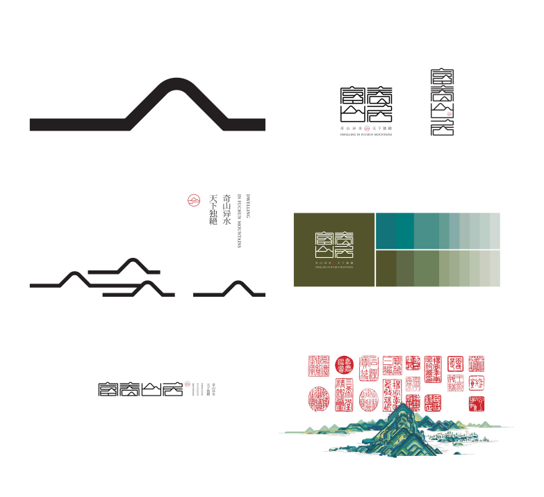摒弃图形部分,通过字体强化富春山居的虚怀隐逸精神,将青黛之山、浩渺水韵的东方语境付诸于字体本身,将青绿千载,山水无垠的意境解构为极简笔划,契合自然的艺术形态,实现字中有画,画中有字,传递独特的富春山居风骨韵律,形成极具精神之源的符号图腾。