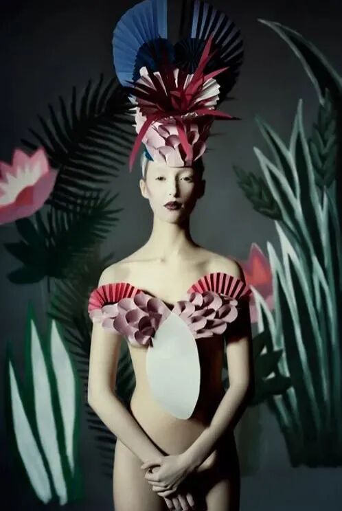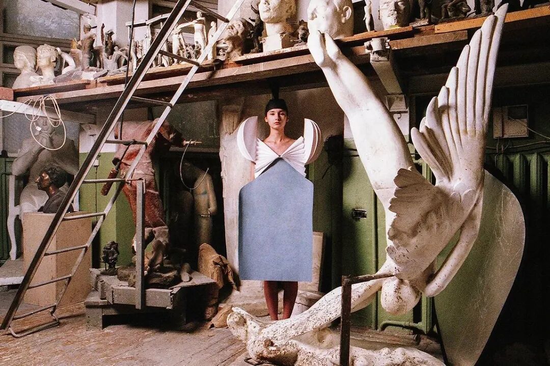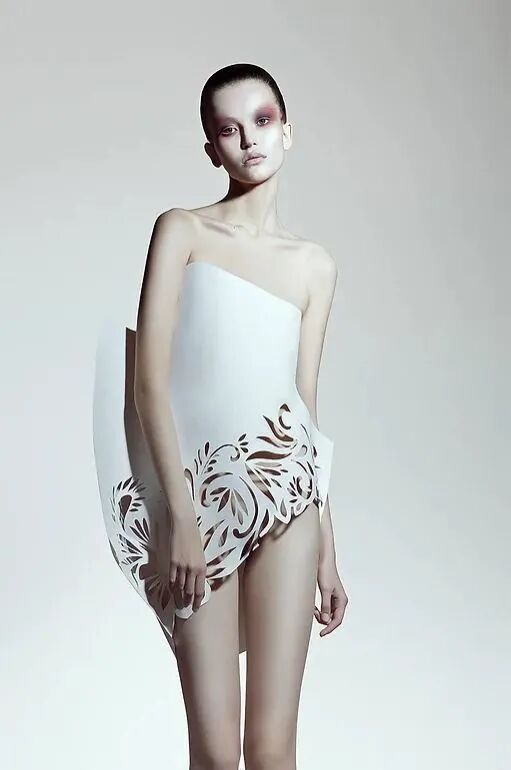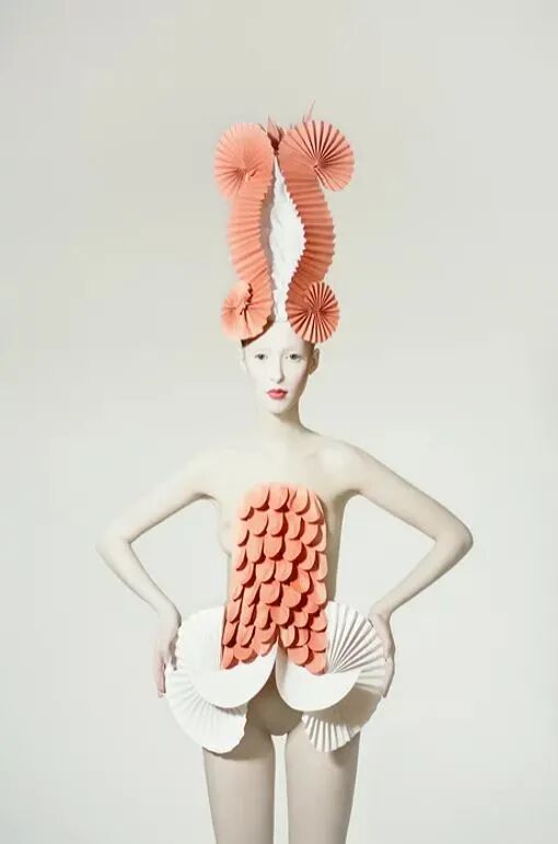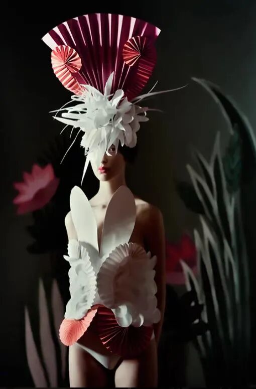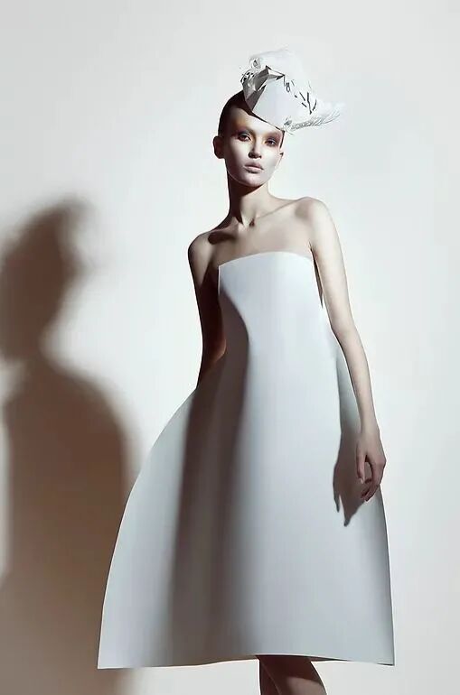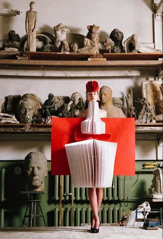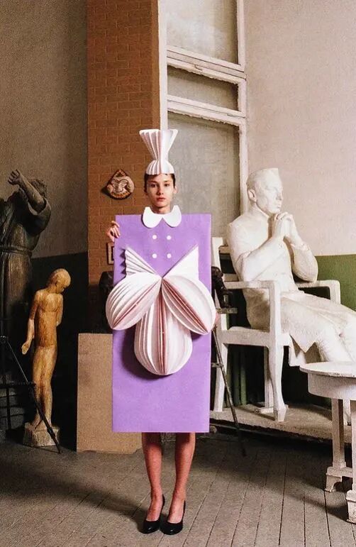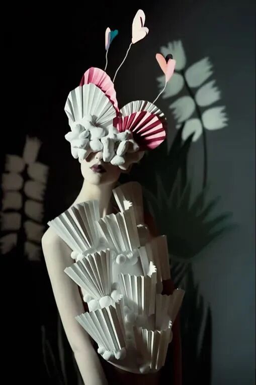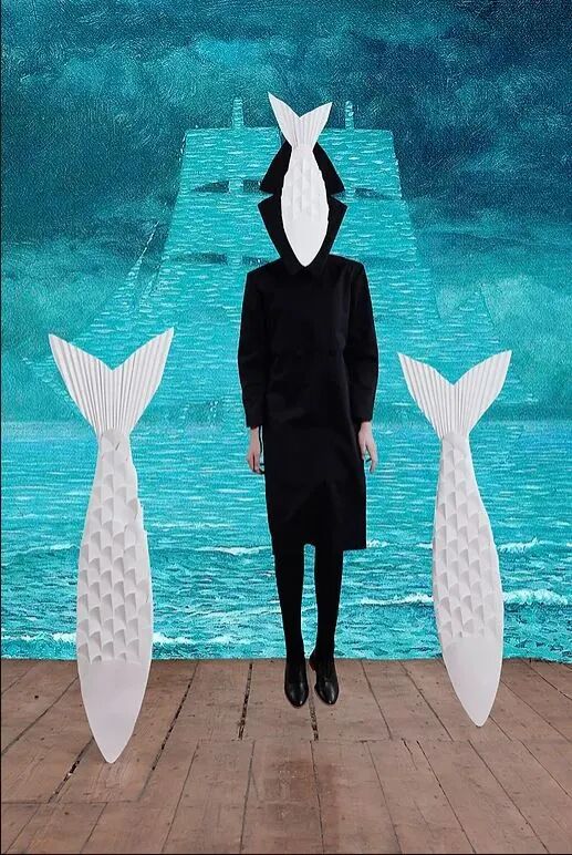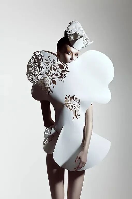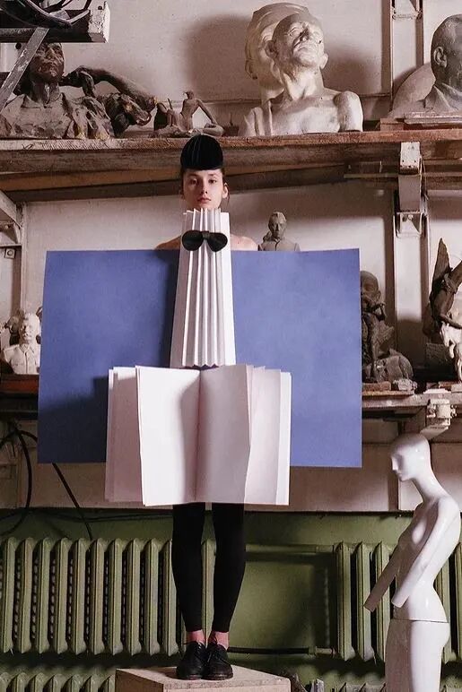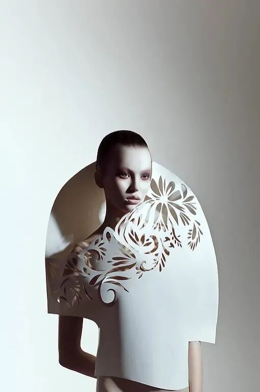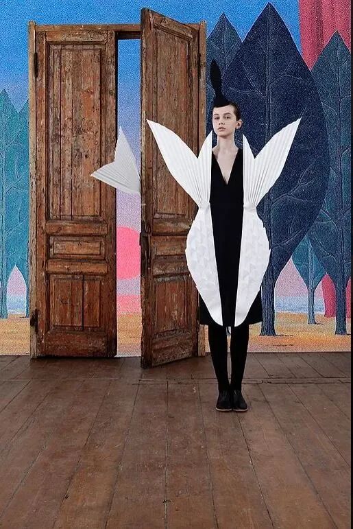 这个系列的服装都由纸制成,也可以称为是剪纸雕塑,Paper cut 系列灵感来自乔治·德·奇里科的作品,人作为人体模型成为作品中的一部分,揭示了生命世界和非生命世界之间的界限。