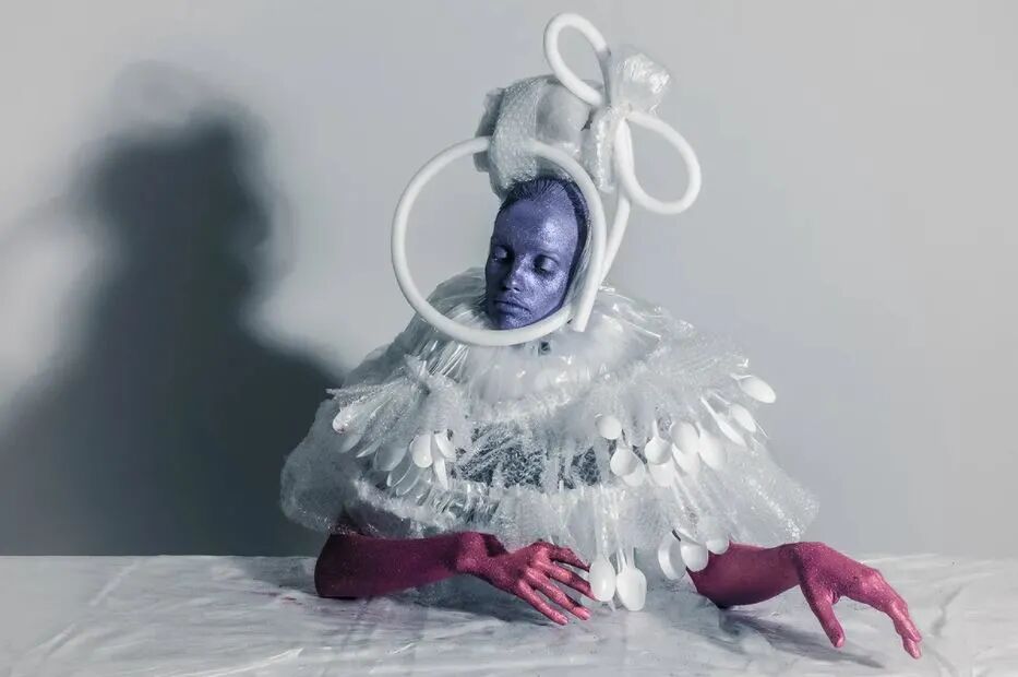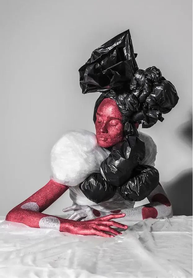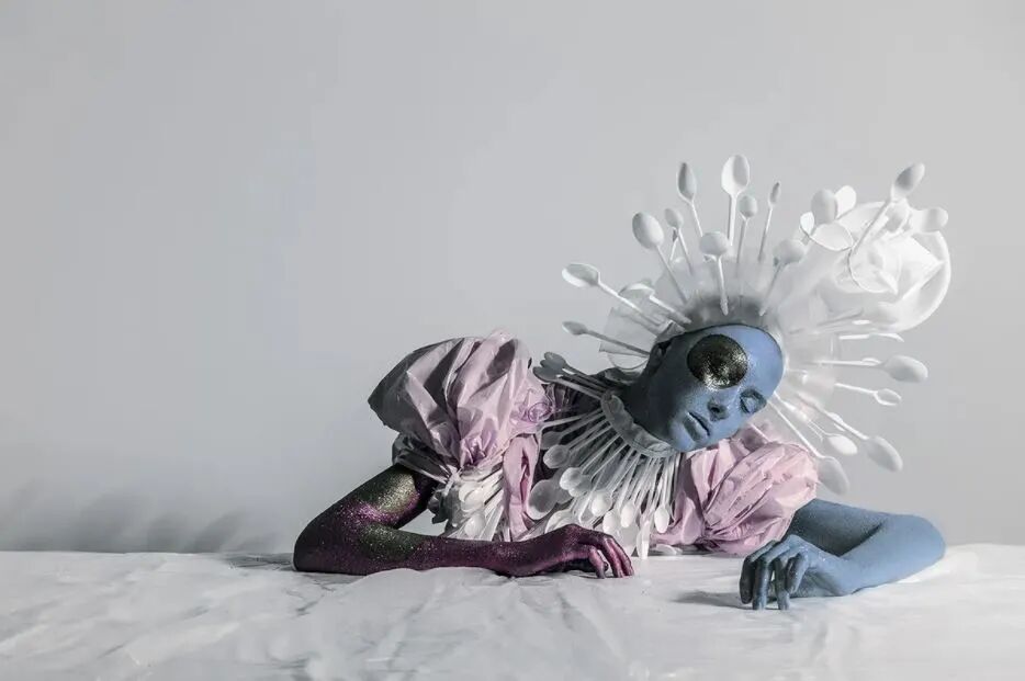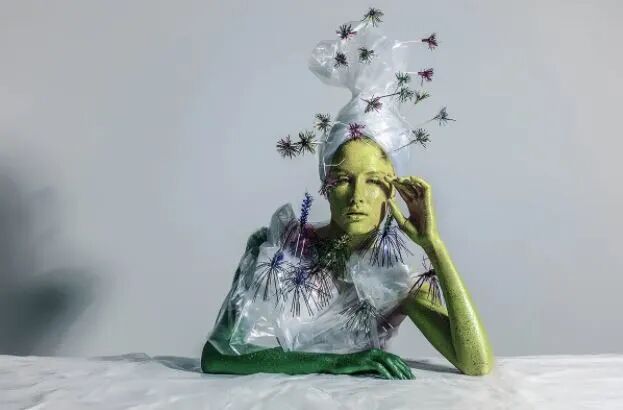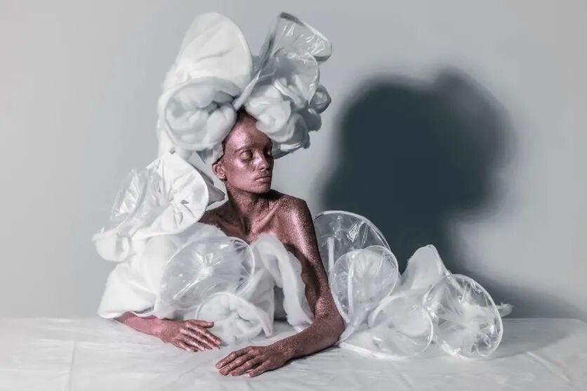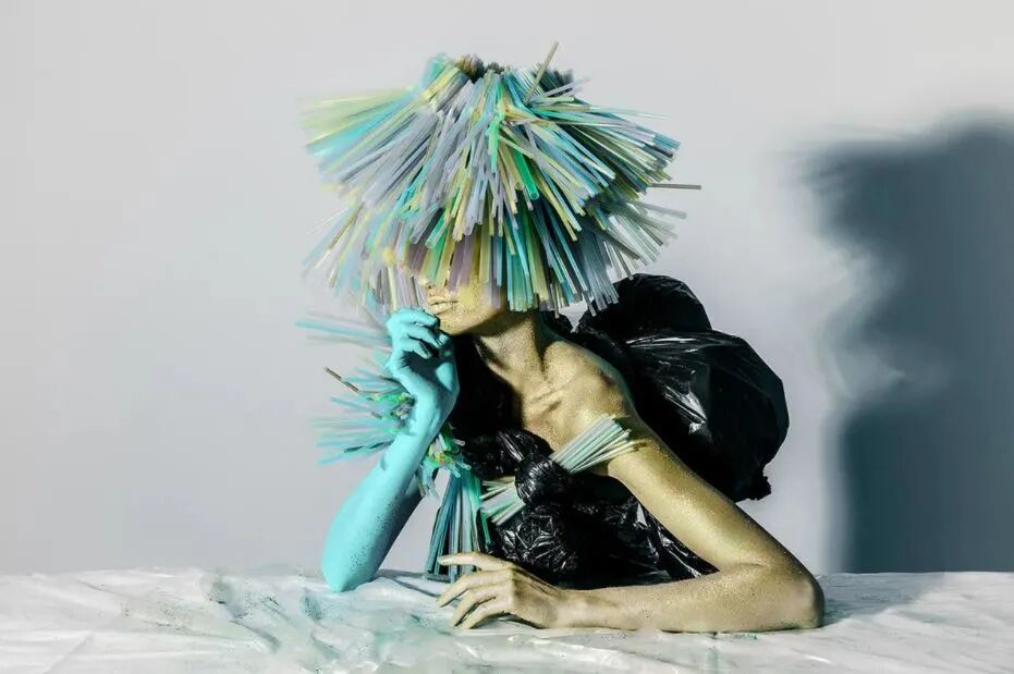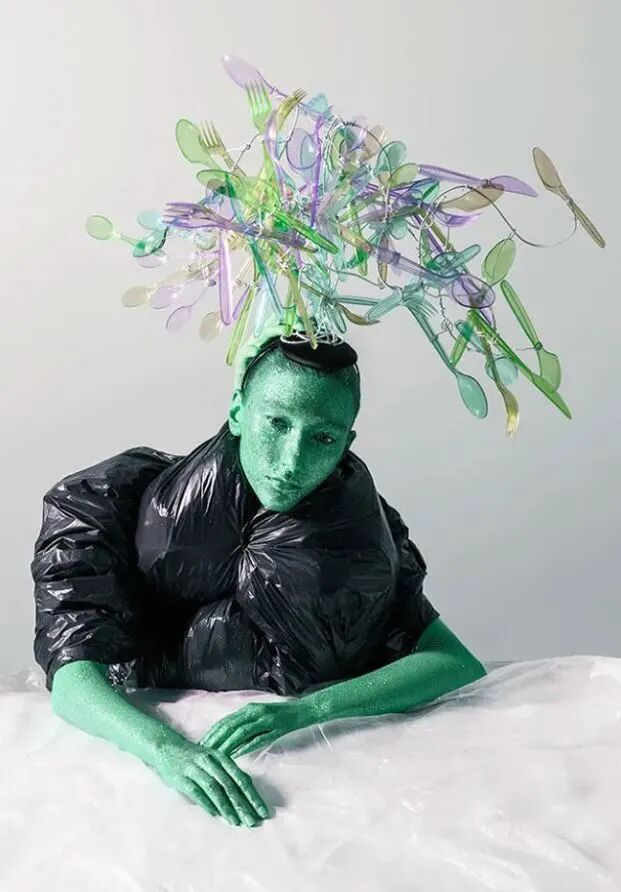 模特们穿着由一次性材料制成的头饰——保鲜膜,垃圾袋,吸管,塑料器皿,铝箔或泡沫包装在高级时装照片中摆姿势。搭配闪闪发光的皮肤和戏剧性的姿势,Venera Kazarova 弥合了垃圾和魅力之间的差距,向我们展示了如何通过正确的方法将垃圾提升为艺术。