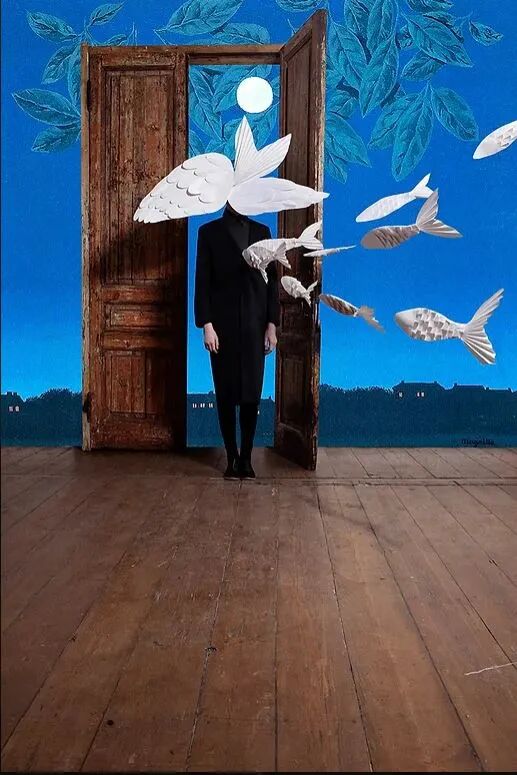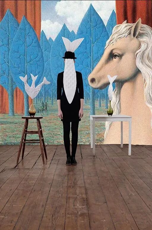这个系列照片中的真实物体——门、木地板和花瓶,都与图片元素进行了结合,照片与照片中的图片这两个现实成为了一个整体,而照片中的图像——鱼、鸟、马等像是从这两个遥远的现实中诞生的一样。