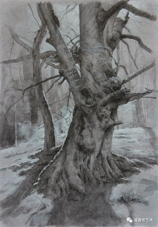 我的风景和树木研究大部分是为我的大型油画做准备和练习。我一直是一个笨拙的风景画家,必须努力改进和发展,这样我才能更有把握地将自然作为神话故事的背景。苏格兰的天气变化无常,坐在户外素描风景有点折磨人,尤其是对于像我这样更喜欢在家在工作室环境中工作的艺术家而言。被具有有趣的根、多节的树枝和个性包的树所吸引的原因之一是,在我看来,它们是景观中最接近人物形象的事物,因此可以在非常相似的情况下使用光影来建模方式。