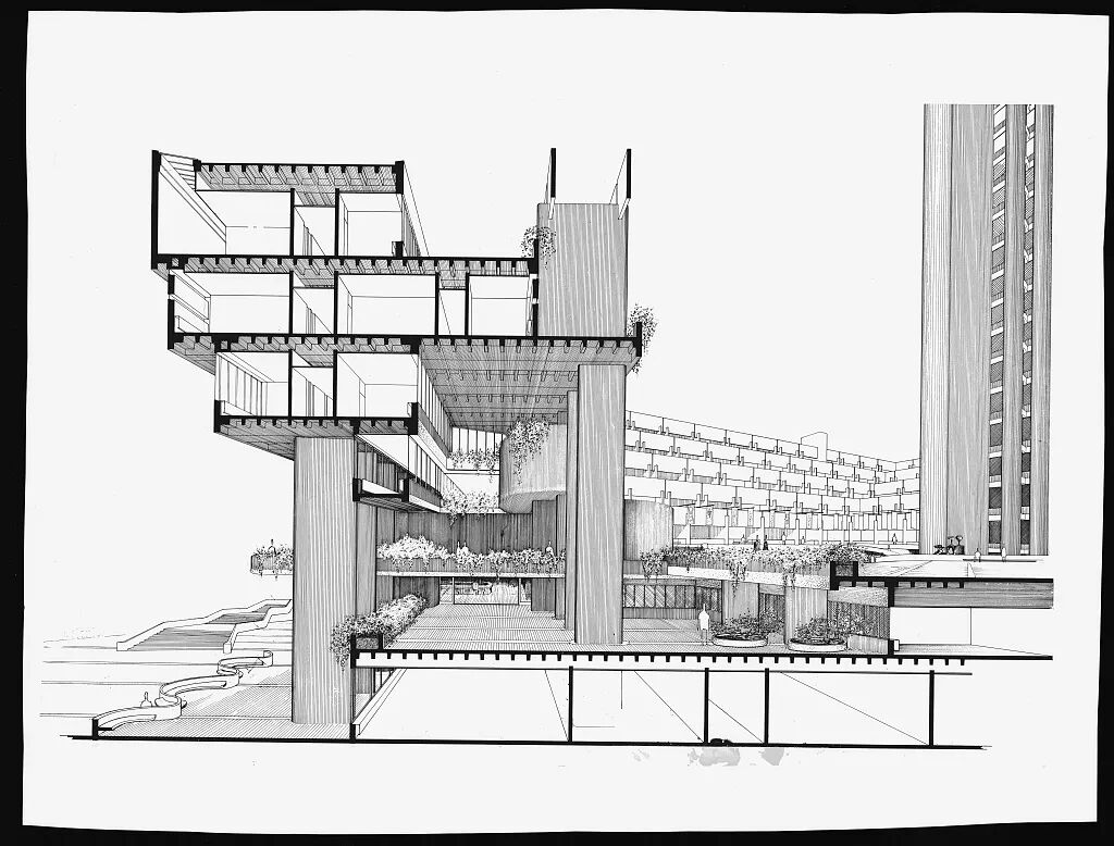 The Colonnade Condominiums, Singapore. Perspective section. 1970