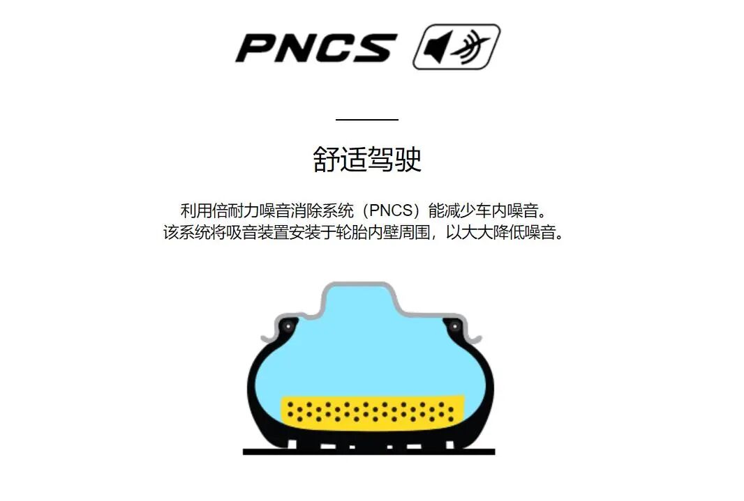 PNCS技术由轮胎内置的特殊吸音材料组成,可抑制空气振动,从而进一步减少传递至车内的噪音,并降低道路噪音。