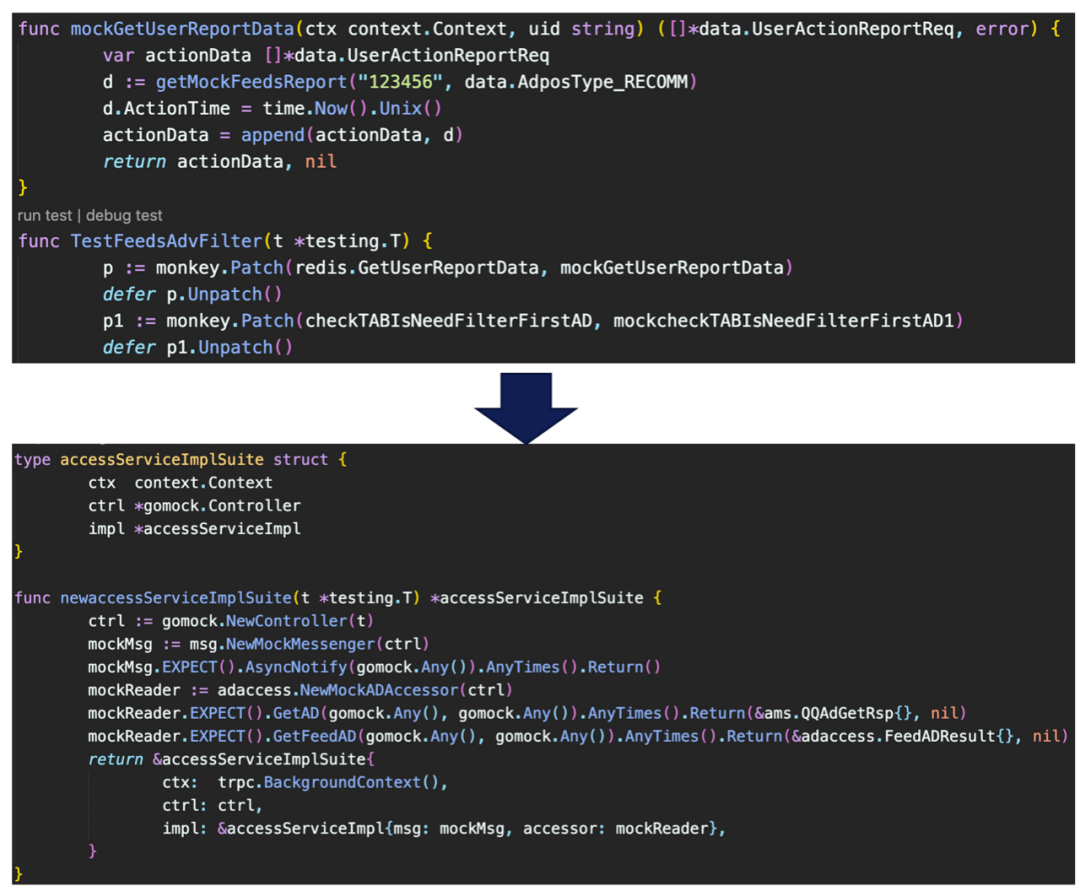 如果一定要monkey mock来对函数打桩时, 说明代码没有符合接口原则。并且Monkey mock的mock函数不可导出 在每个调用的此函数的包内单测时,都需要重新写一遍mock。