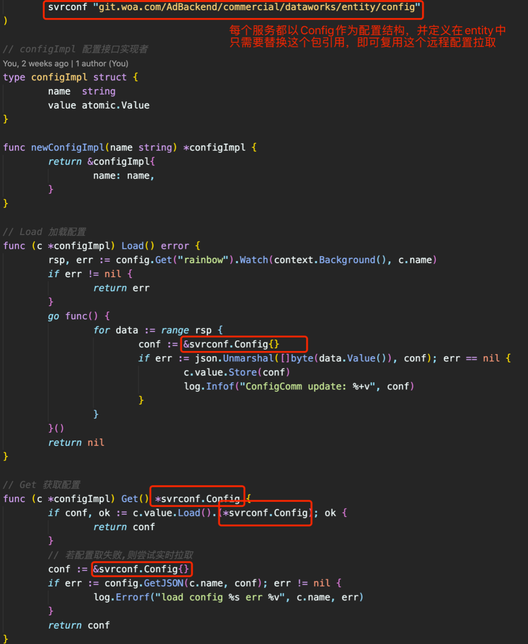 现在几乎每个服务除了框架配置外,会接入远程配置(七彩石配置),读取远程配置的逻辑几乎每个服务都要重新实现一遍,因为配置的最终输出一定是一个个性化的结构体(每个服务的配置肯定都不一样),所以很难用一套代码解决,这里采用了一个包替换的方式,将出口的结构体通过引入不同的config entity定义,来实现代码的通用(仅是通用,还实现不了零copy)