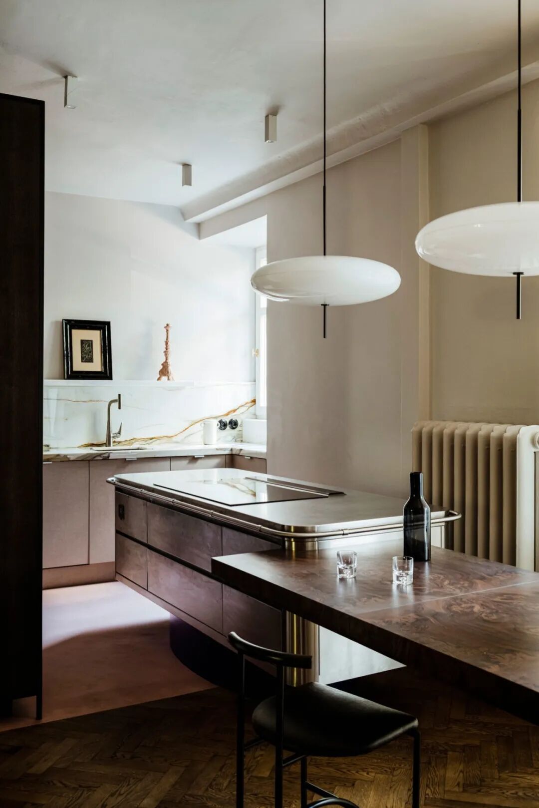 苔藓绿色的墙壁和人字形地板营造出一种低调的氛围,与拱形门廊、褶皱造型的Le Klint灯具和曲线天花板镂空形成了愉快的对比。一个高度抛光的深色大理石框架将门厅与外面的客厅隔开。