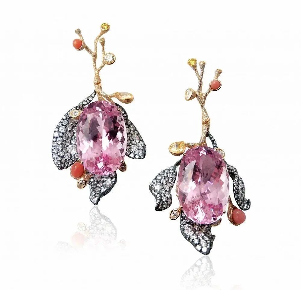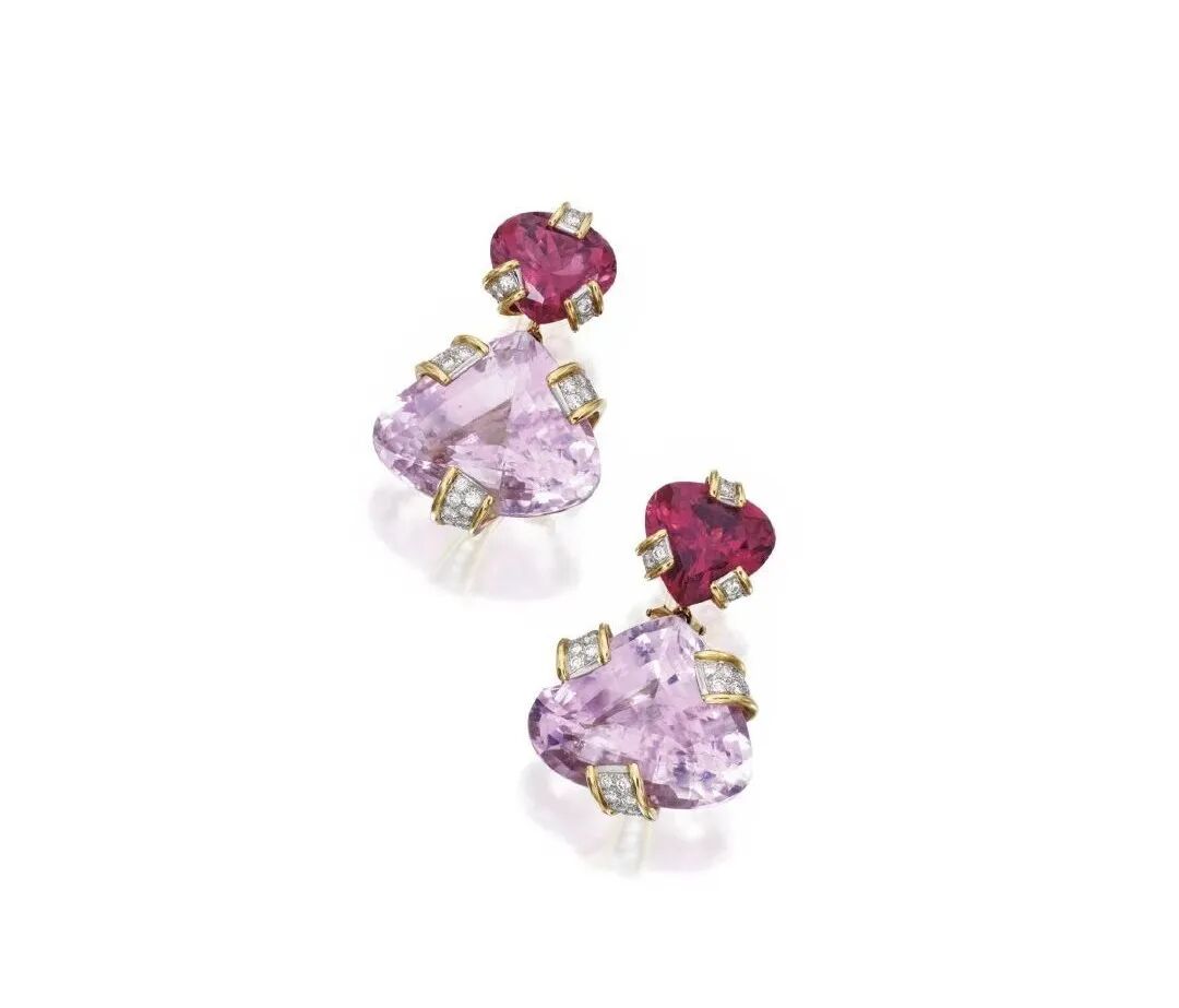 上图这款镶嵌着水滴形紫锂辉石和海螺珠的耳环,由珠宝大师陈世英设计。