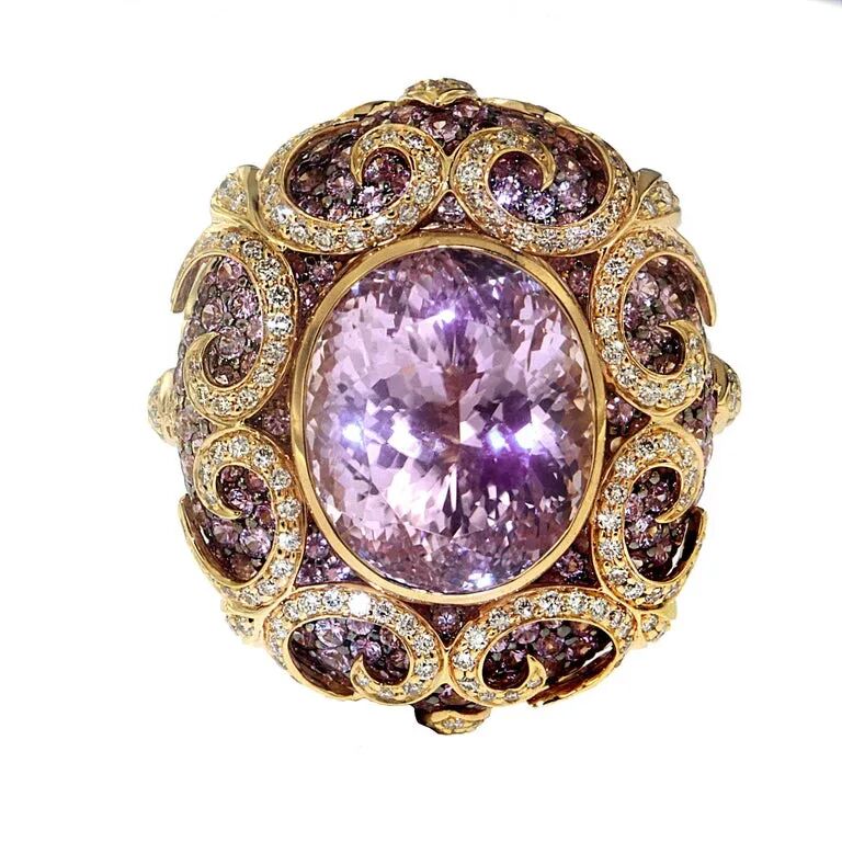 紫锂辉石在灯光的照射下,会发出极其惊艳的紫色光芒。它那纯澈紫粉的外表,加上个头大等优点,让它成为非常受欢迎的宝石,频频出现在只能在晚宴上才能看到的高级珠宝上,因此,它也被称为“晚宴女王”。