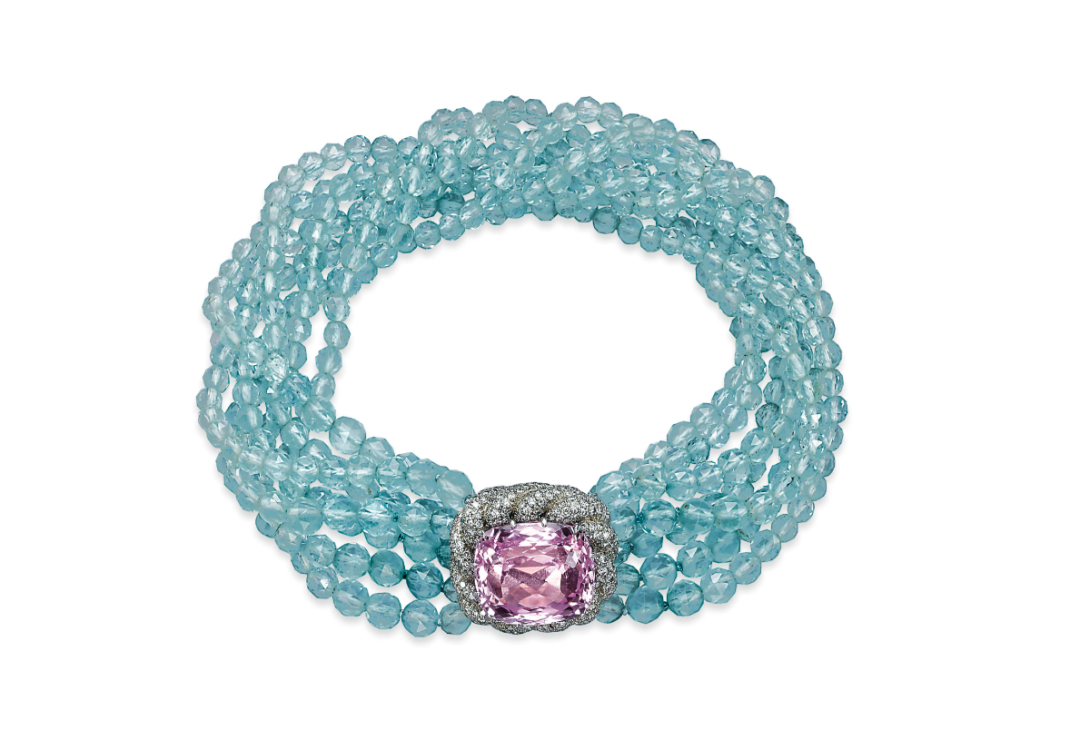 上图为卡地亚设计制作的紫锂辉石项链,在七股海蓝宝石刻面珠项链上,镶嵌着一颗重约61.65克拉的枕形紫锂辉石。海蓝宝石的天蓝色搭配紫锂辉石娇艳的淡紫色,古典浪漫。
