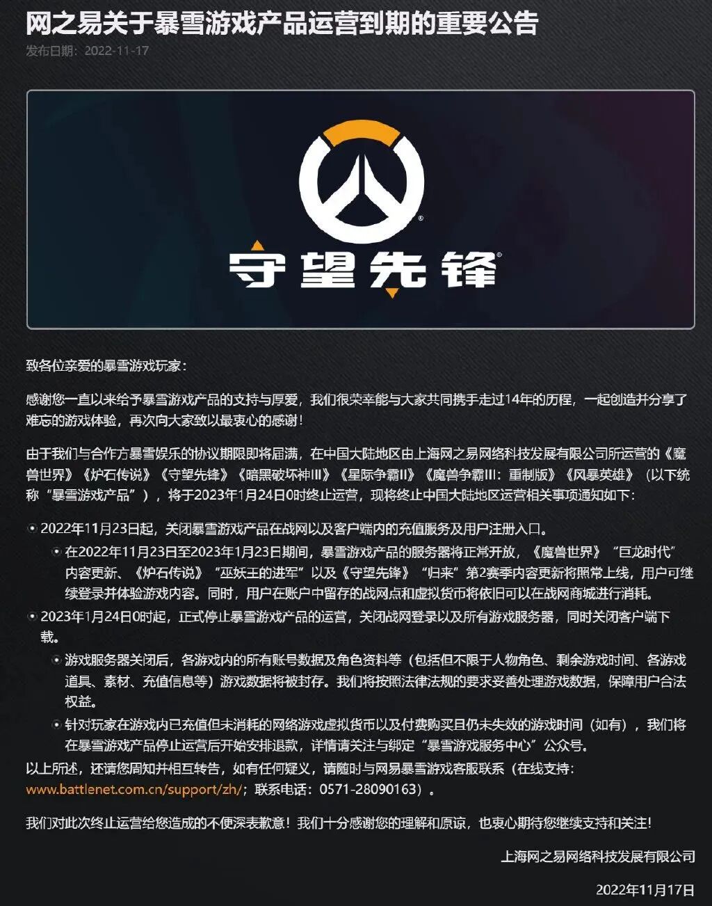 暴雪娱乐发布声明表示:由于未能与网易续签授权协议,将暂停在中国的大多数暴雪游戏服务,包括《魔兽世界》《炉石传说》《守望先锋》《星际争霸》《魔兽争霸3:重铸版》《暗黑破坏神3》和《风暴英雄》。