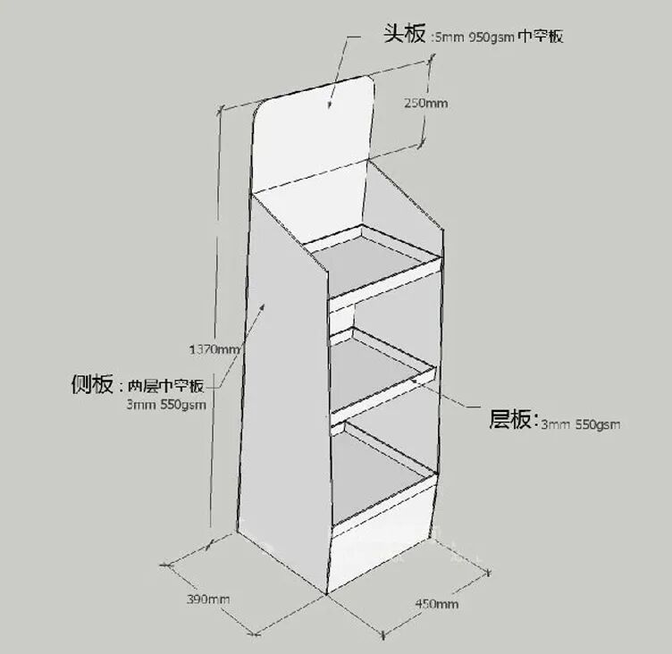 结构设计的好坏直接影响到生产出来的展架的质量。纸展示架结构设计时必需考虑生产过程中的变形情况,用料的好坏直接影响变形大小跟货架的承重。