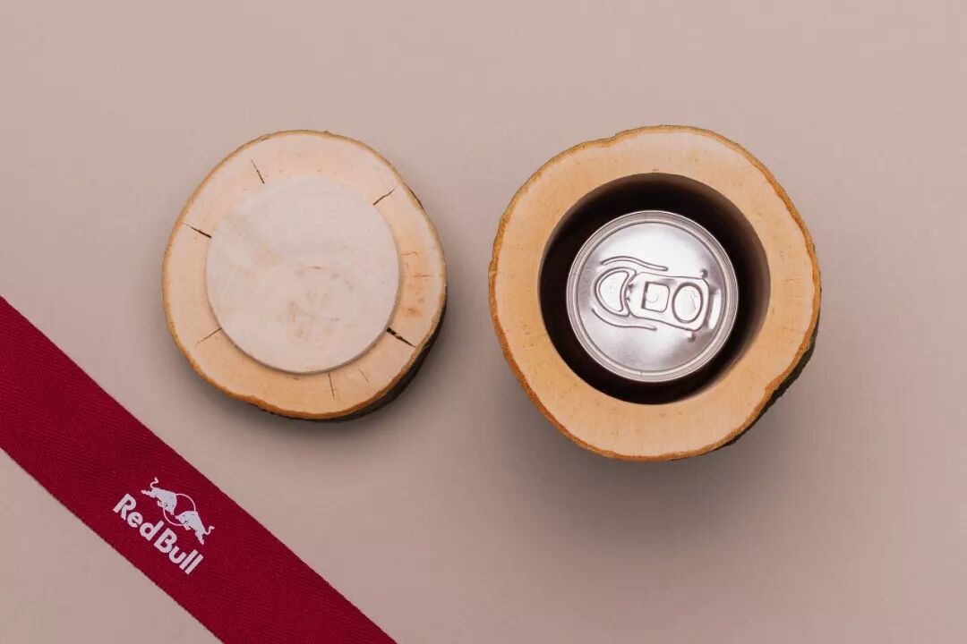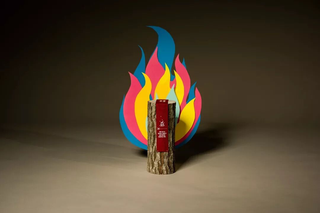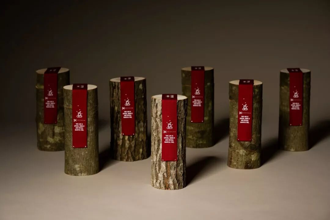 将一罐饮料放在一根原木中,手工制作,每一根原木都不同。天然的礼盒包装,增添了冬日气氛,当然也可以燃烧。在木头里放了特殊的粉末,在燃烧时火焰会有不同的颜色。