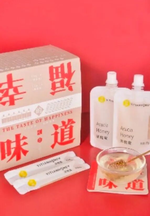 这是另一款蜂蜜的包装,现在这种独立袋装的蜂蜜设计也逐渐开始流行起来了。相比传统的罐装蜂蜜,小容量袋装蜂蜜能提供给消费者更好的体验。想想一下,你正要去泡一杯蜂蜜水放松一下,当你用勺子从罐子里挖出一勺蜂蜜放到杯子里,蜂蜜不小心滴到桌子上或者蜂蜜罐子上,所以这时候你不得不停下来把蜂蜜清理干净。