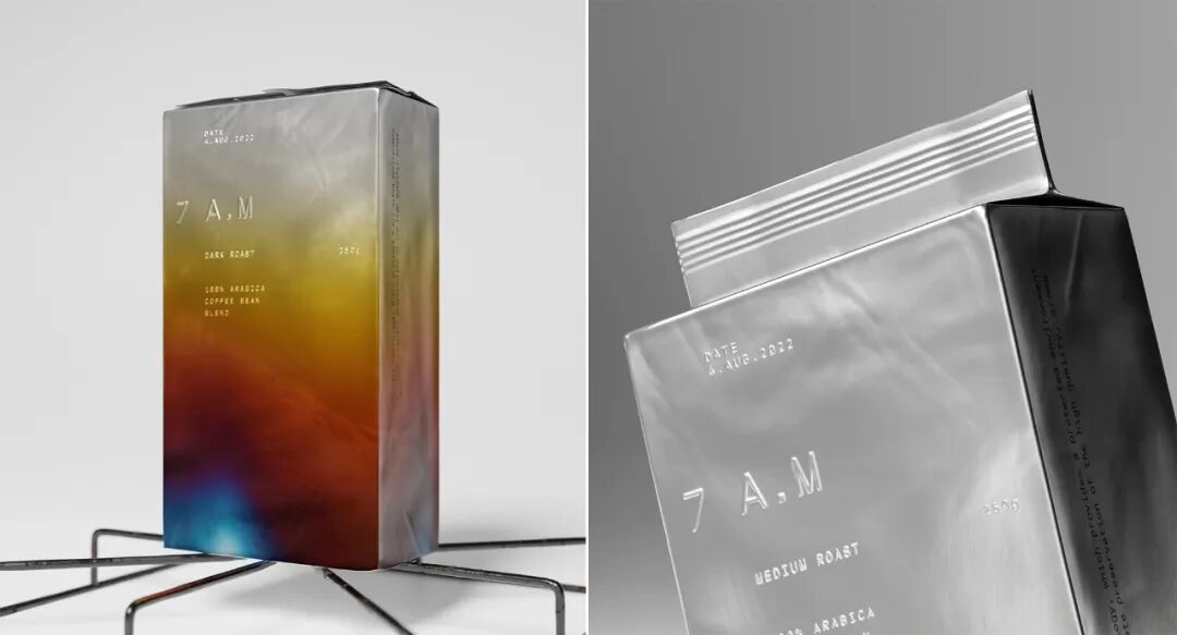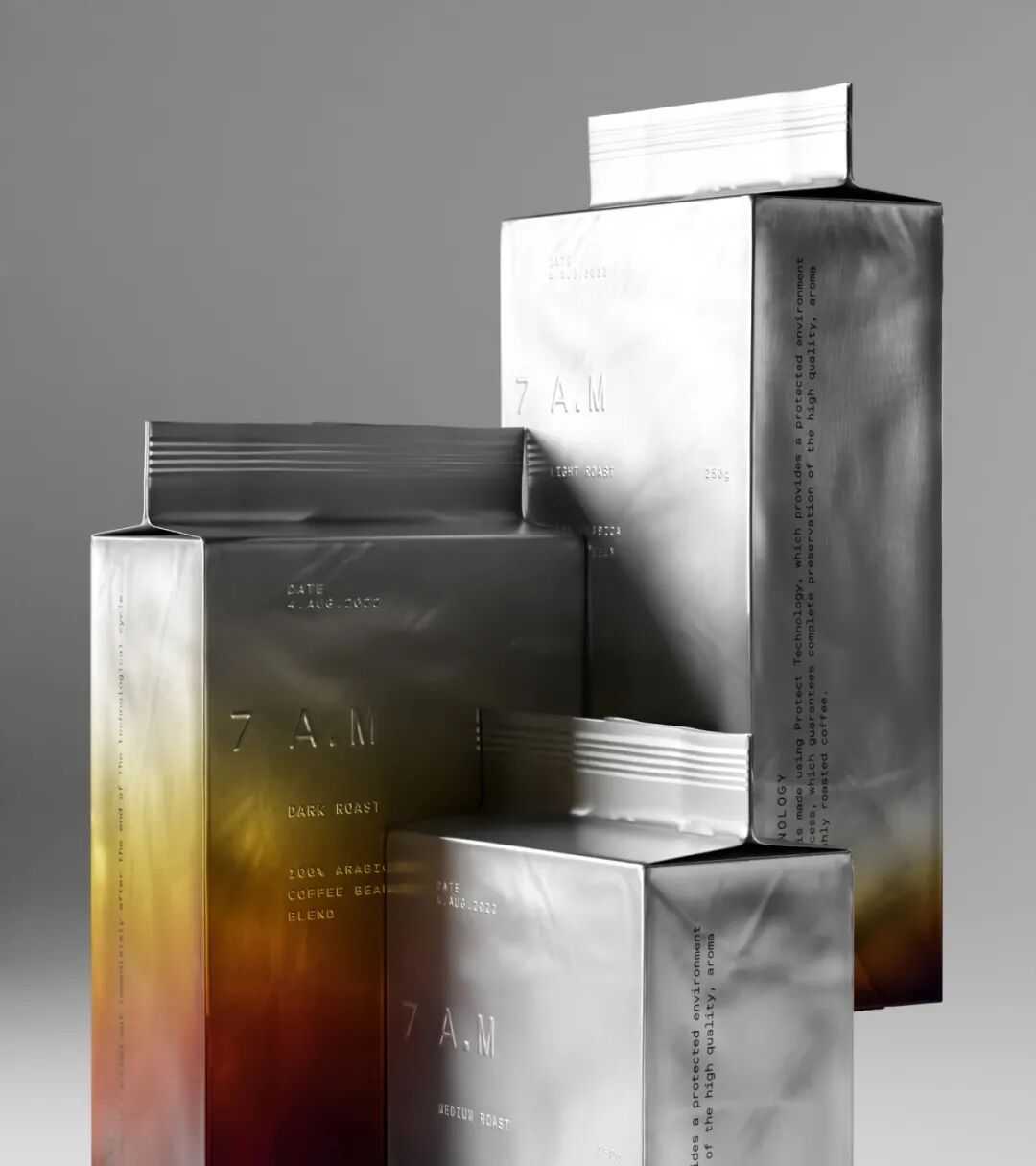 该产品有三种SKU,根据咖啡的烘焙水平,从浅到深。咖啡烘焙的水平实际上反映在包装的设计上,烘焙的程度越深,包装的颜色就越深。铝箔的金属质感一比一还原了蓝色火焰。