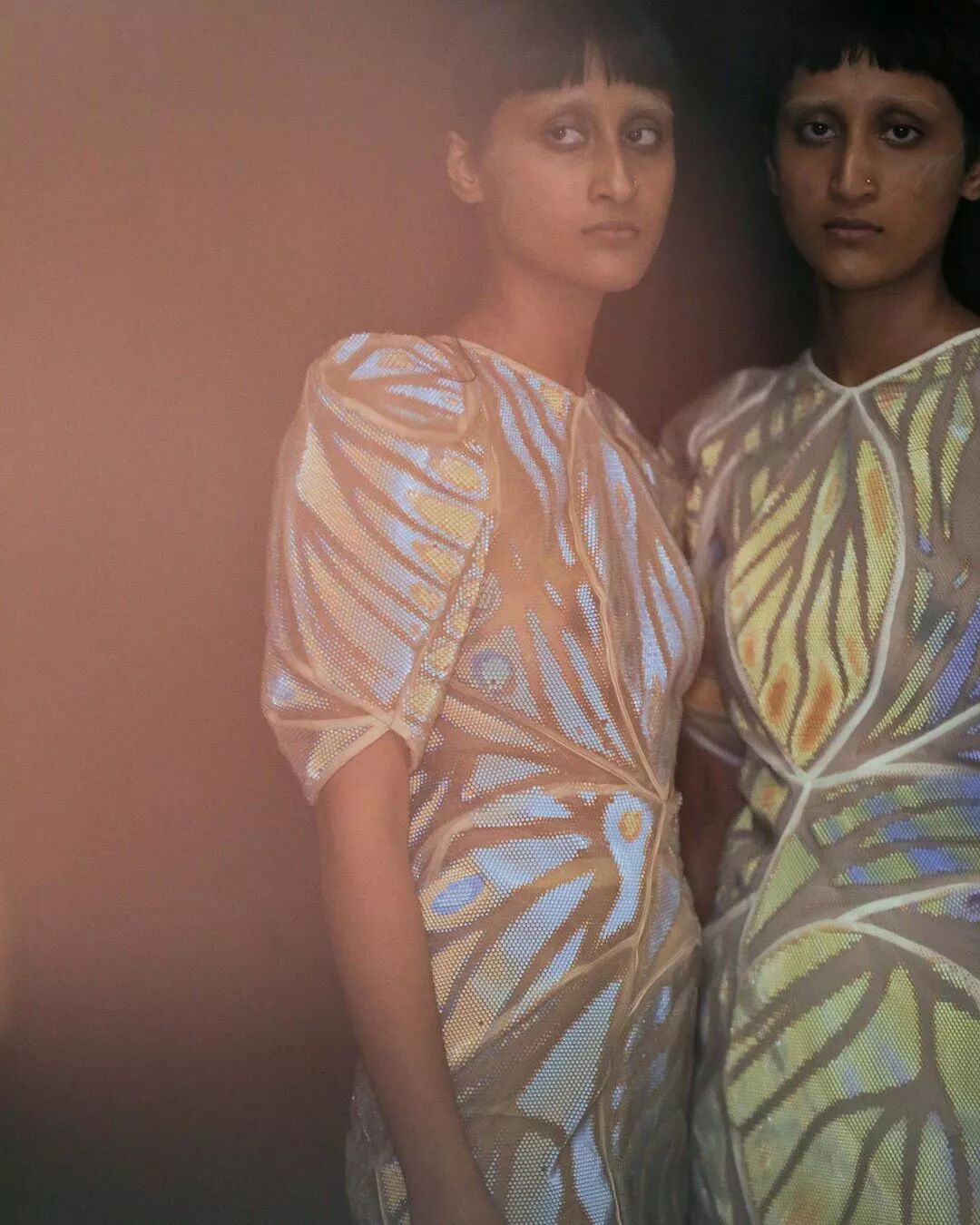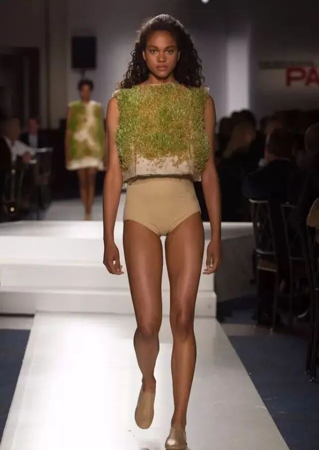 连衣裙的色块拼接营造出蝴蝶翅膀脆弱的玻璃效果,暗棕色调的紧身衣裤也把斑驳的树皮清晰的呈现。如此革新的3D技术,这是大自然、时尚和科技的一次破壁的结合。