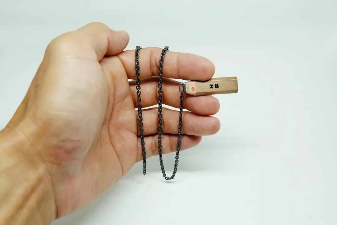 你能想象吗?一根直径不足1厘米,有硬度的铅笔芯,可以被雕刻成一根项链,就是女孩子脖子里佩戴的那种金属链,这位艺术家就做到了。李健竹不仅雕出了整条项链,还在上面加上了装饰,看上去更加真实了。想象一下,将一条这样的项链戴到脖子上,回头率真的不用发愁了。