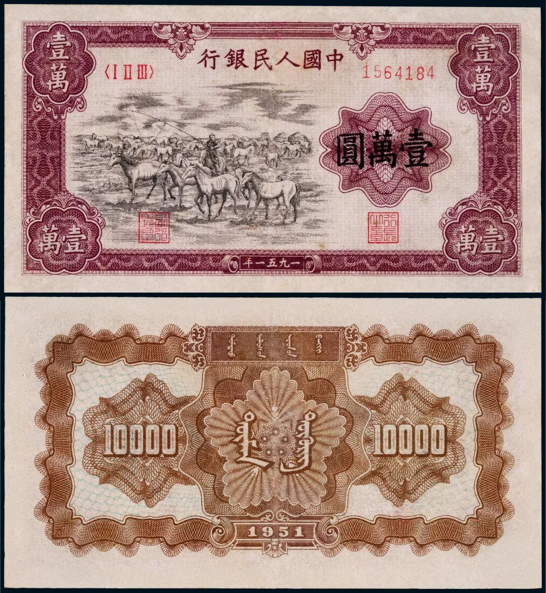 背蒙文,仅于内蒙地区行用,因使用时间短暂印量稀少,且在退出流通时几乎全数收兑,存世极少,为一版币中最珍稀品种,亦为纸币收藏之大名誉品。