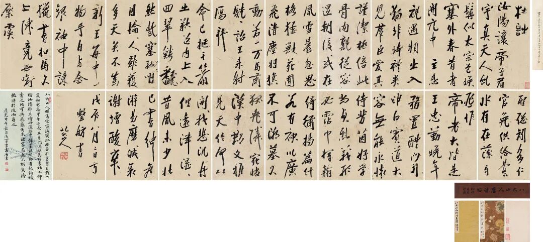 古代书画板块甄选近八百件精品。其中包括“遂性草堂”藏唐寅《松冈图》、稀世宋代法书珍品张即之《论书帖》、龚贤《行书自书诗十二首》长卷、清代宫廷画家合绘为雍正帝祝寿的《寿意图册》、文徵明《金山诗画合璧卷》、唐云旧藏石涛《荷花》、八大山人《行草<杜诗>册》等。古籍部分,墨迹书札中《傅抱石致张院西信札》共计40通60页,为历年拍场所见最大、最完整的傅抱石书信真迹。
