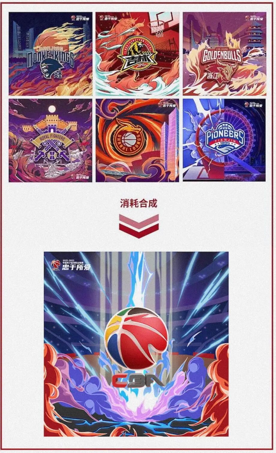 集齐这 6 支球队队徽数字藏品,可以合成 CBA 联盟队徽数字藏品。集齐后,原有单个球队的就被消耗掉,单个球队队徽数字藏品要 29.9 元一个。
