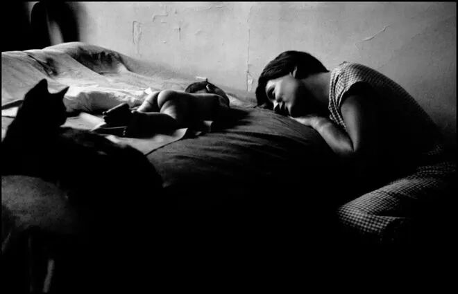 1953年,一位母亲和她六天大的女儿、还有家中的猫咪,在窗边的床上毫无防备地玩耍着。这个亲密而随意的瞬间,被她的丈夫艾略特·欧维特用相机记录了下来。这一年艾略特加入了玛格南图片社,而这张未经设计的“生活片段”被认为是人文主义摄影的代表之一。这一幕让无数母亲想起了她和她的孩子的初生之日。