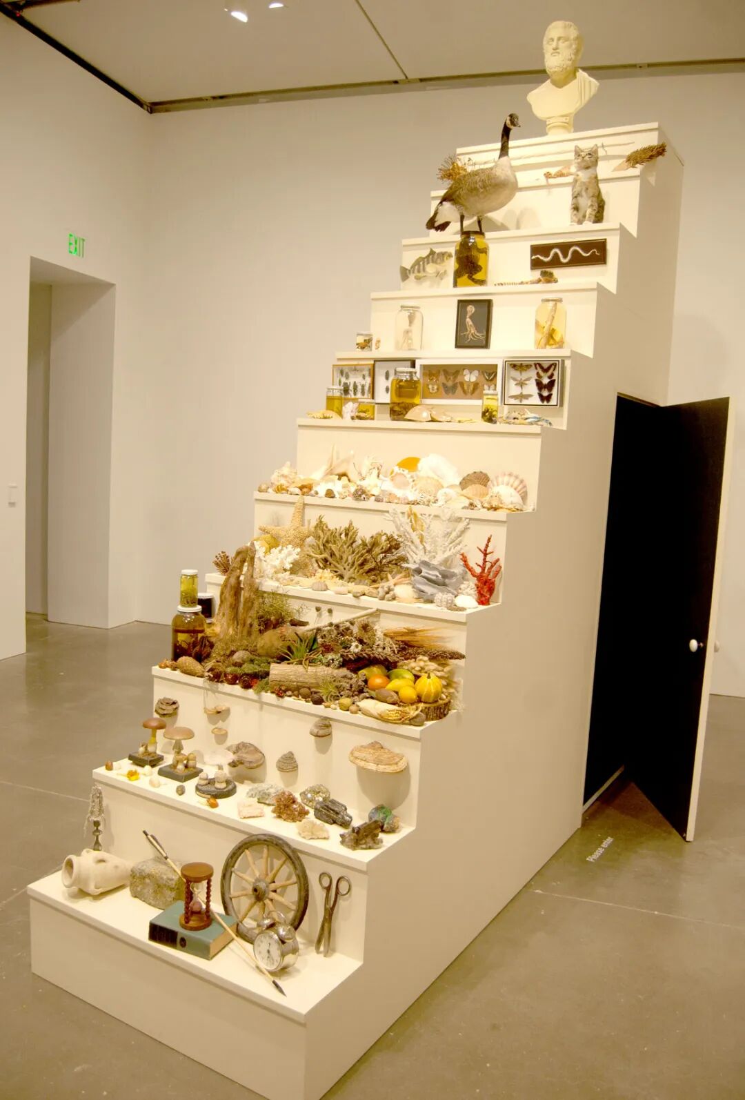 Mark Dion作品《自然等级》,在十层阶梯上摆放着自然标本、动物标本和人造制品。