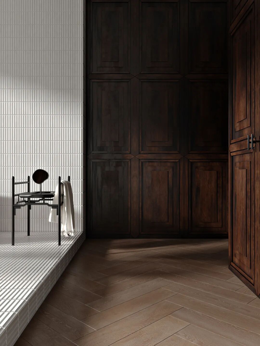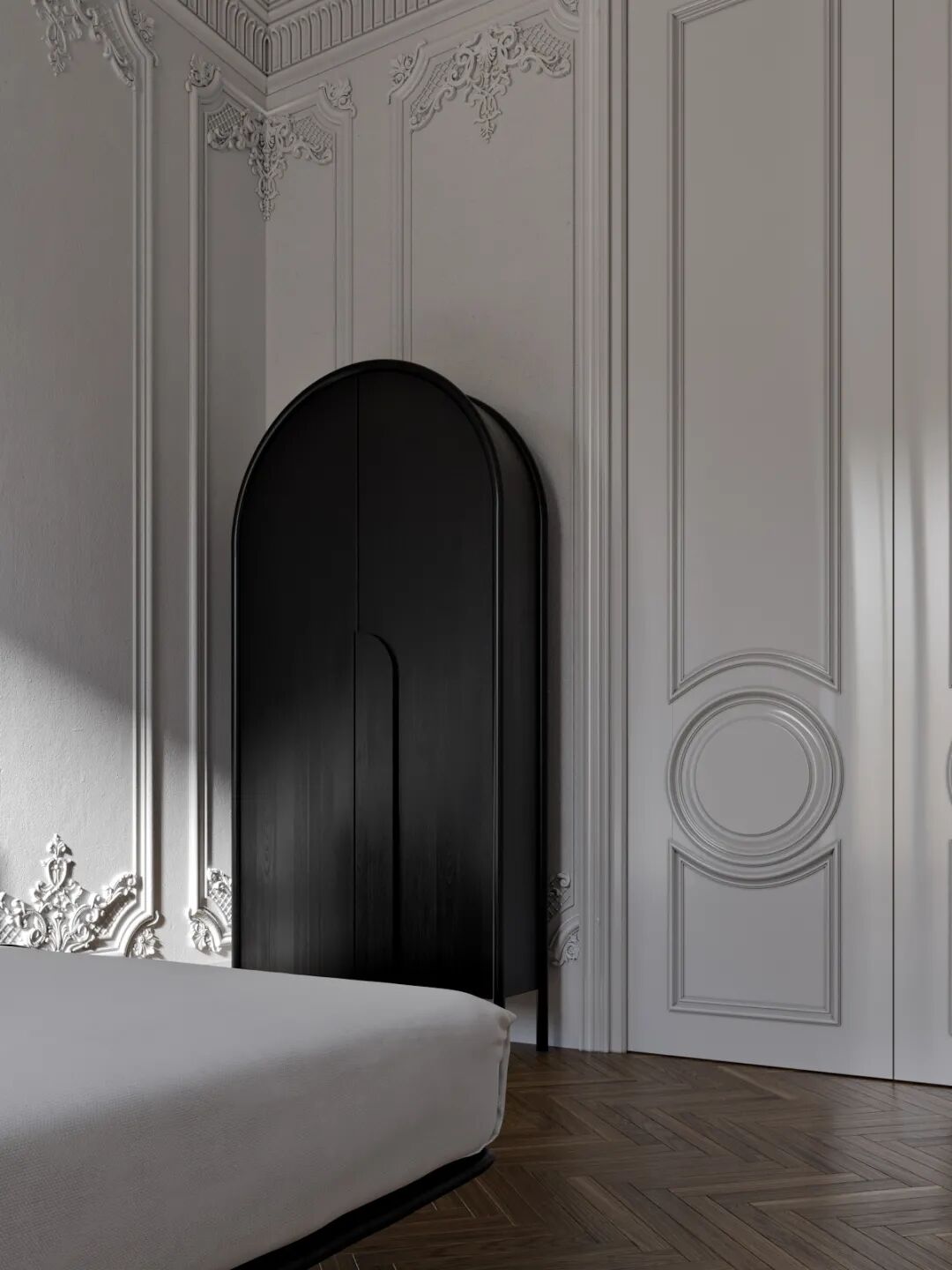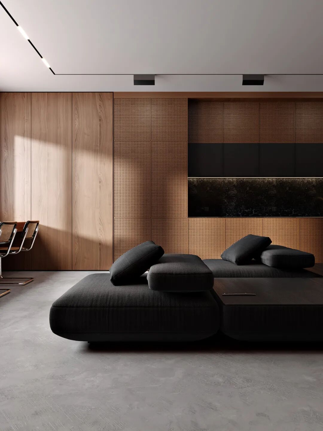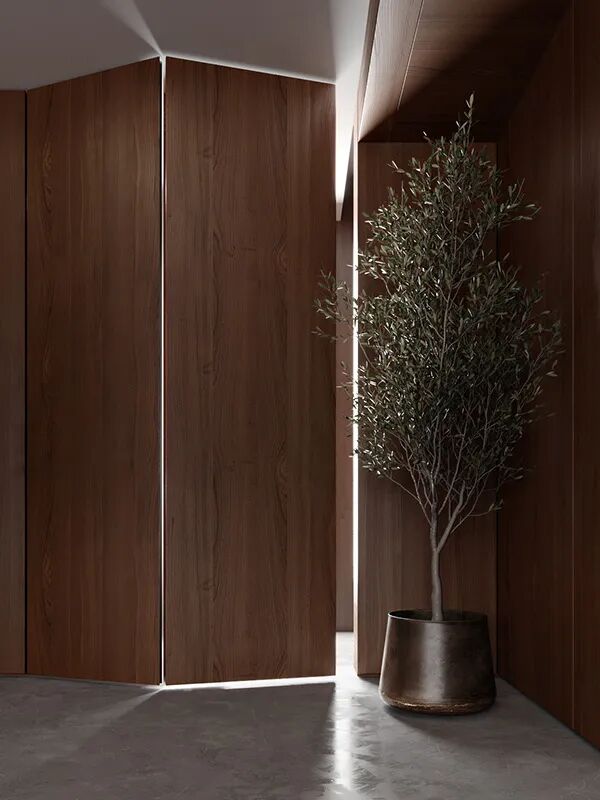 空间之中干净利落的线条,展现出空间的几何美感,增加了储物空间,营造出沉稳有格调的氛围。