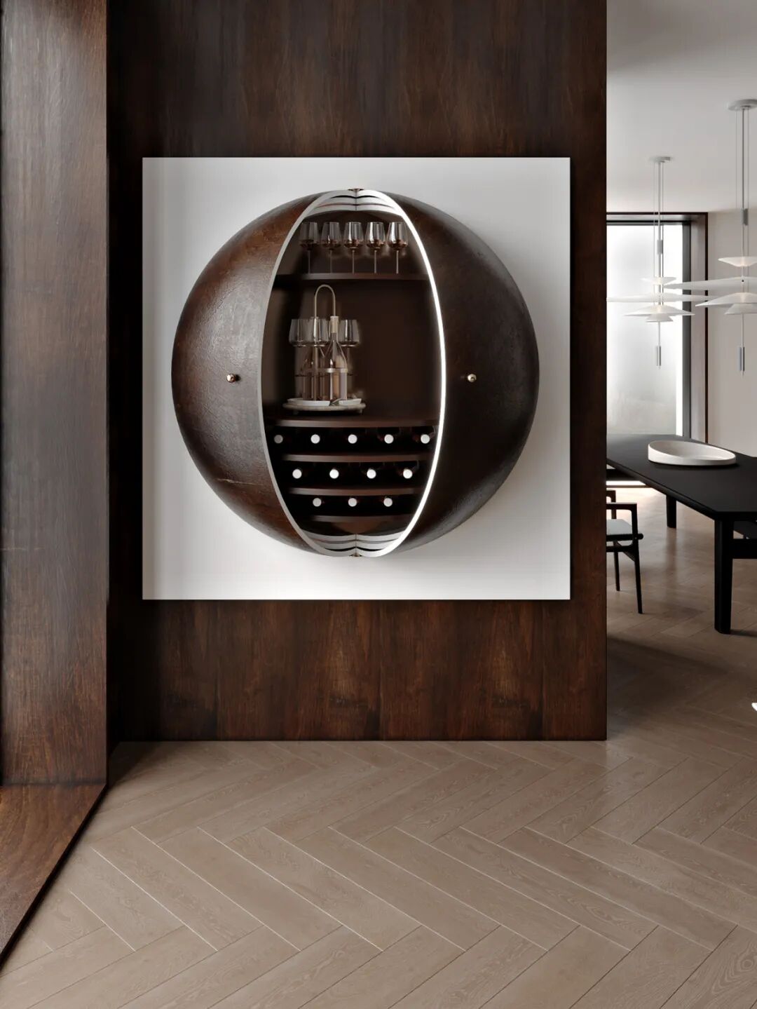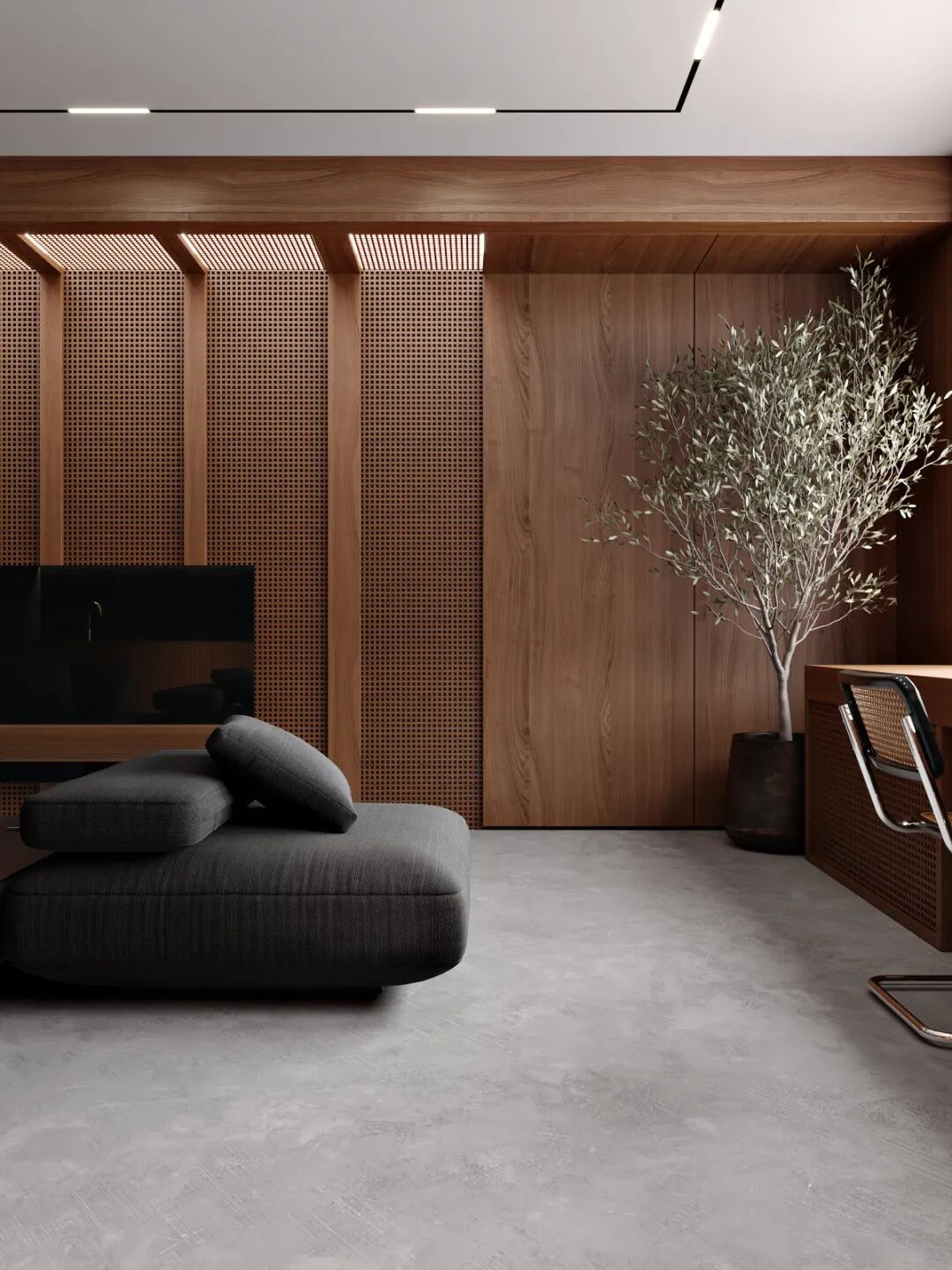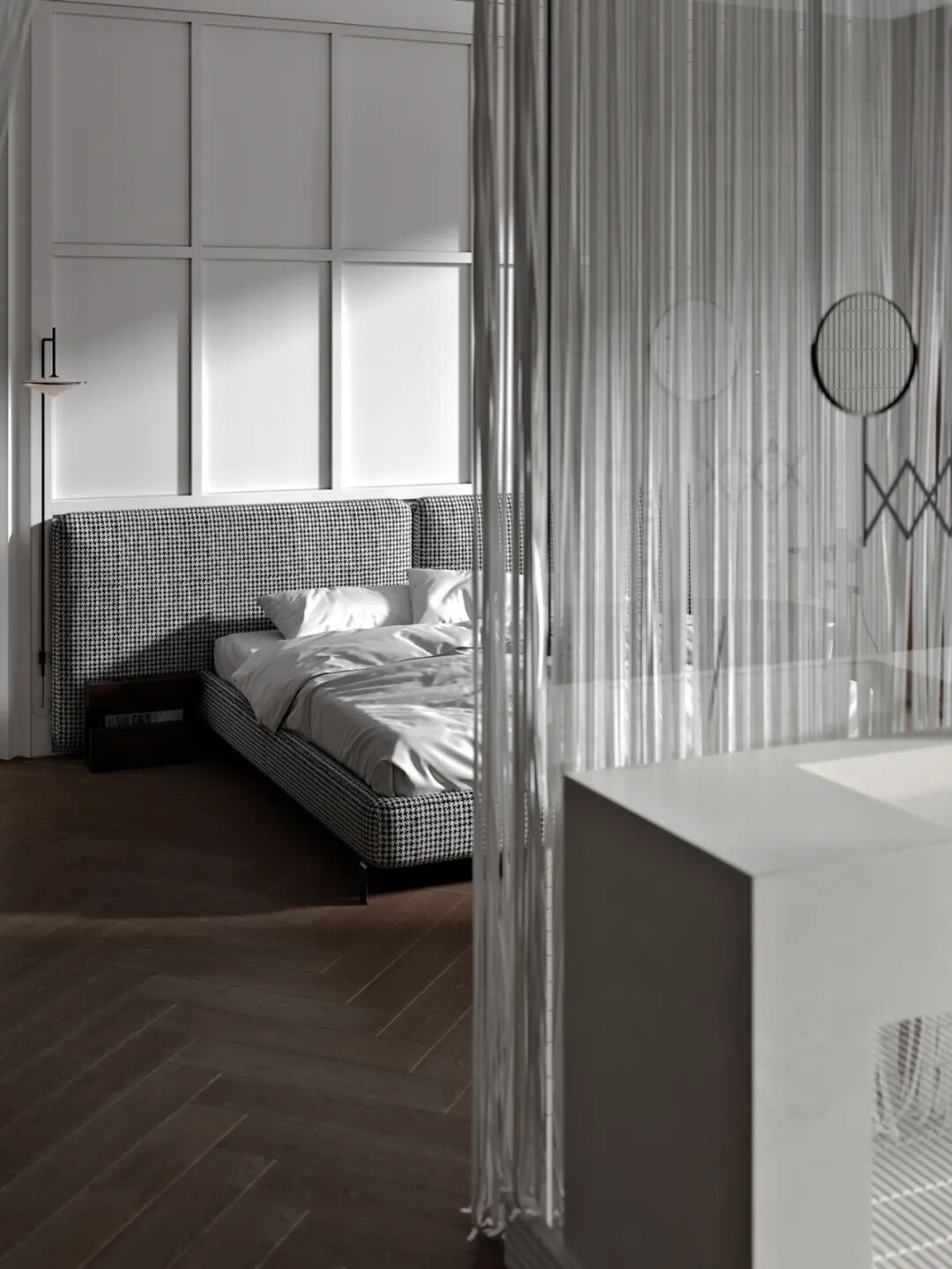 空间之中干净利落的线条,展现出空间的几何美感,增加了储物空间,营造出沉稳有格调的氛围。