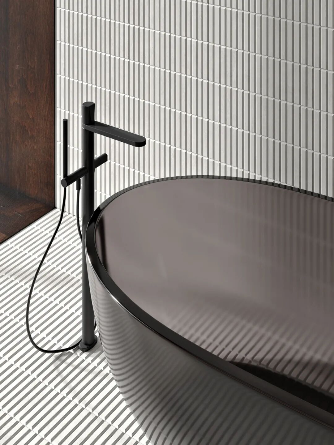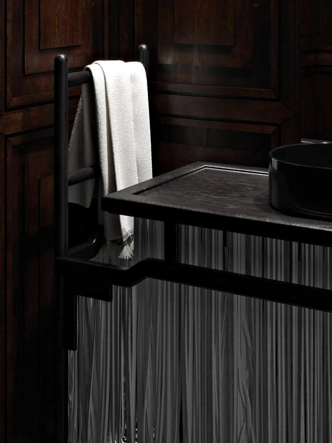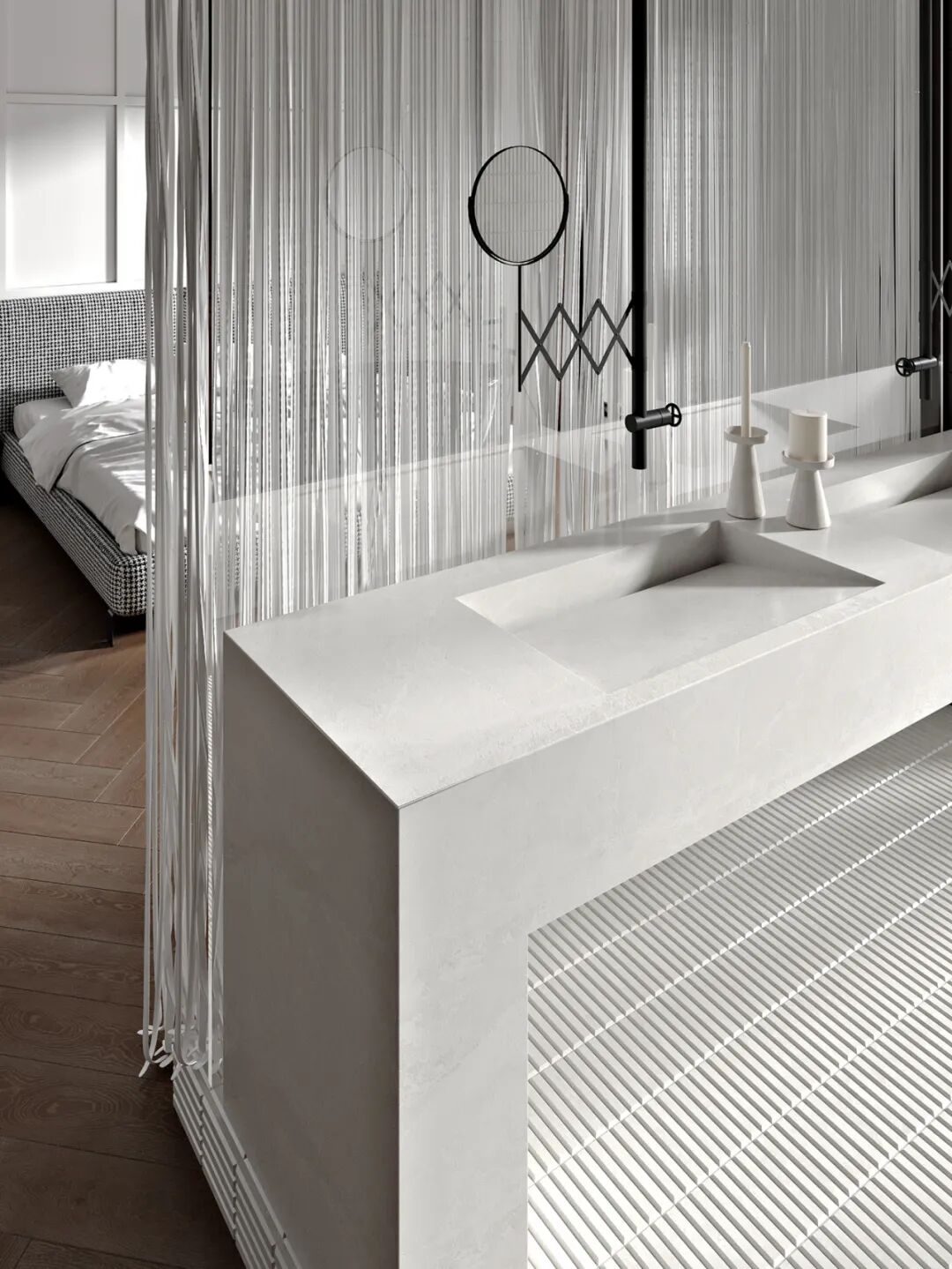 浴室里很好的融合了艺术气息,白色的缎带既分隔了空间也提升了空间的整体质感,兼具美观性与实用性。在白色的空间中利用黑色作为点缀,展现出如同水墨画一般的氛围。
