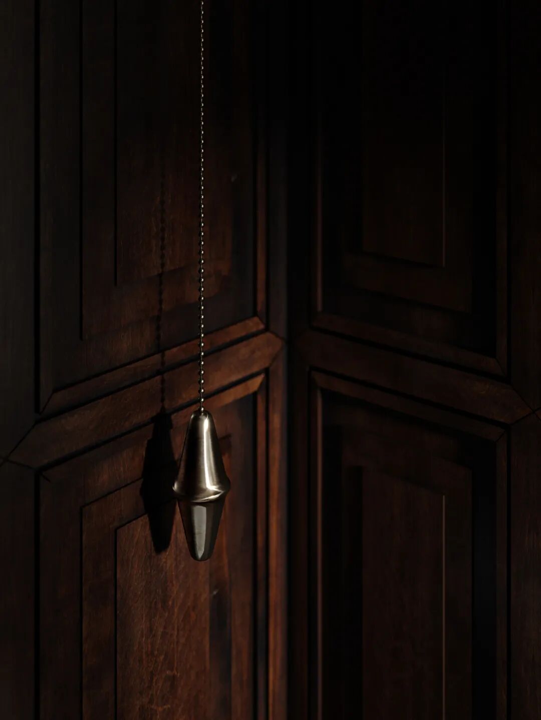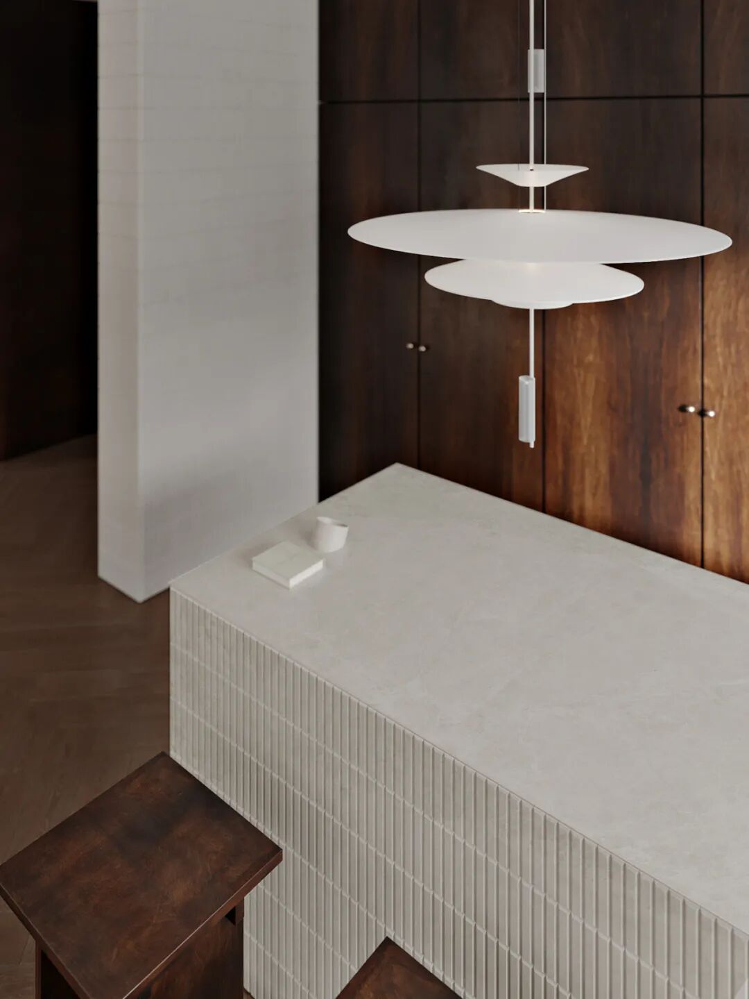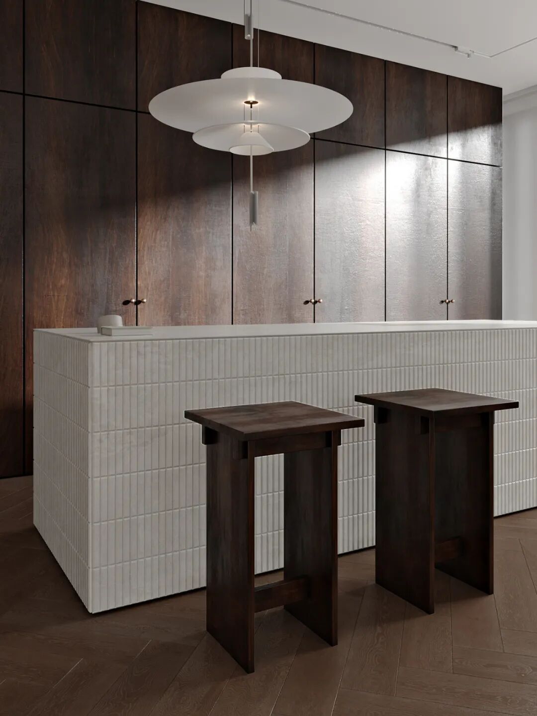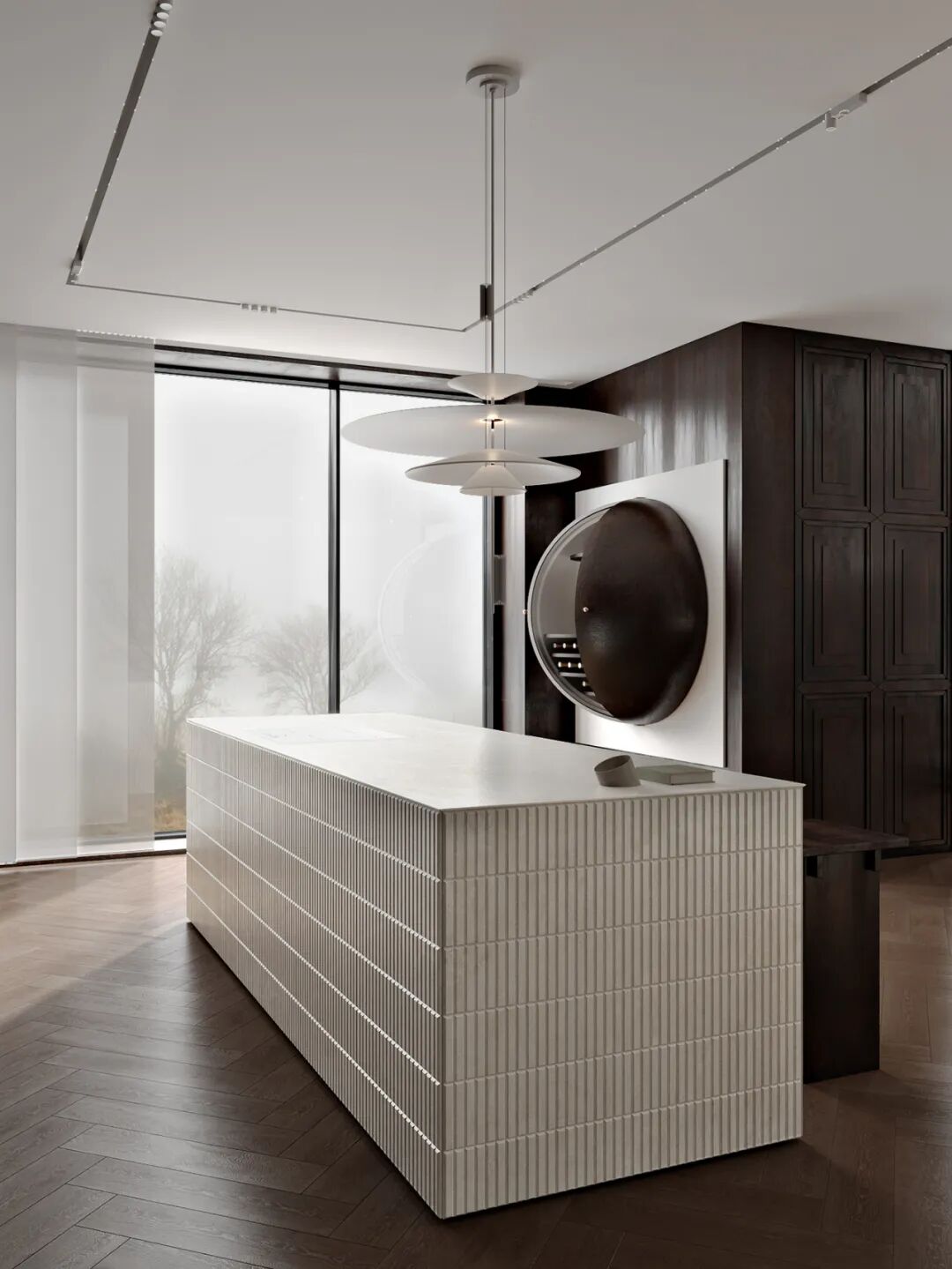餐厅里,映入眼帘的是天花板上的白色吊灯,柔和的形状与丰富的层次为空间增添了时尚的气息。岛台选用瓷砖材质,与周围的深木色形成了材质与色彩上的对比。
