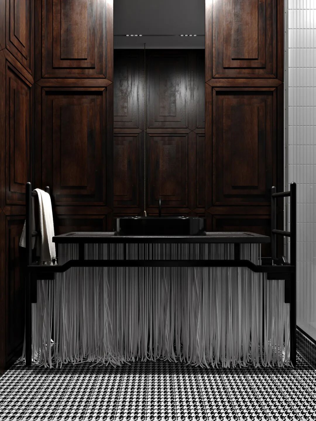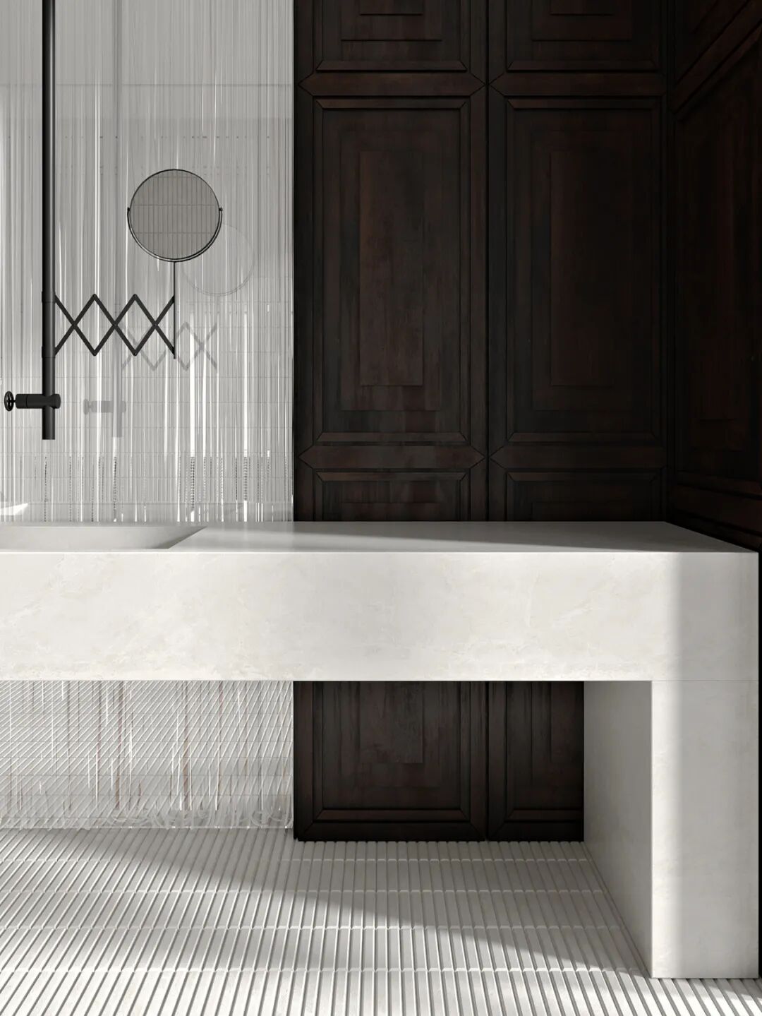 The artistic atmosphere is well integrated in the bathroom. The white ribbon not only separates the space but also enhances the overall texture of the space, which is both aesthetic and practical. In the white space, black is used as an embellishment, showing an atmosphere like an ink painting.
