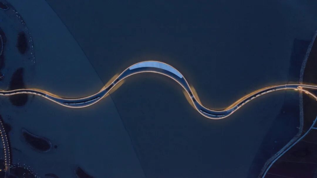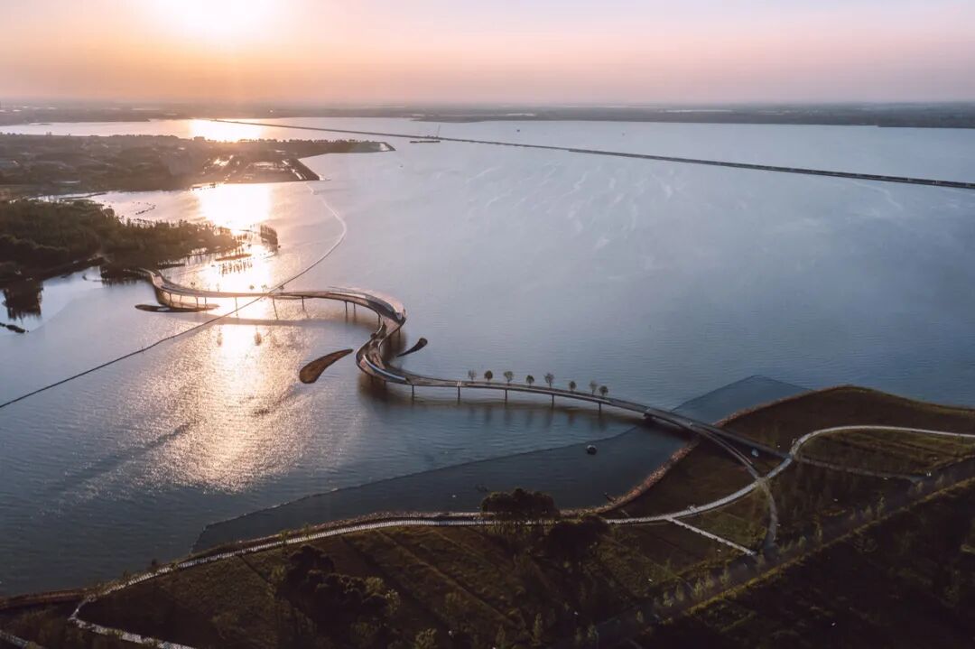 BAU建筑与城市设计事务所(BAU)用一座蛇形曲桥连通了上海元荡湖域的两片湿地,将建筑、基础设施和景观与既有的路径和自然环境相结合,形成了自行车道、人行道与绿化带相互交织的“混合结构”。