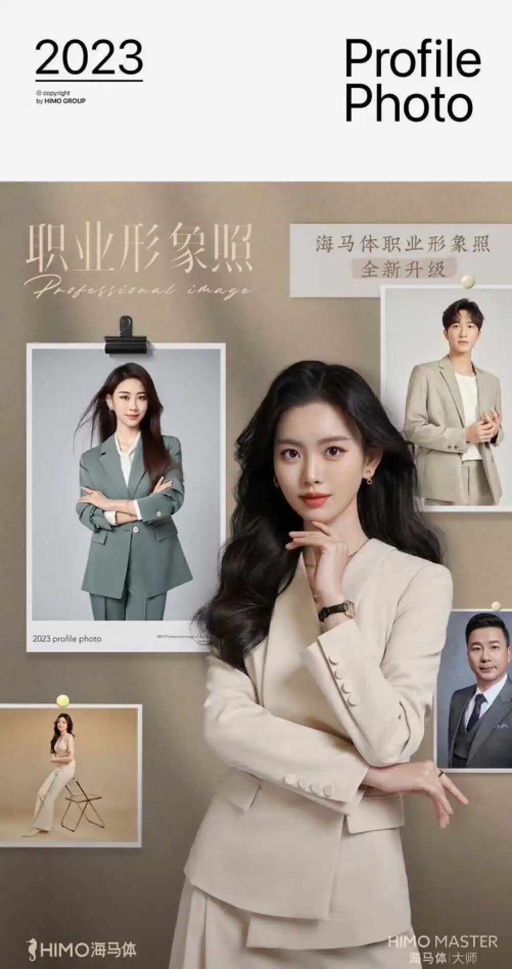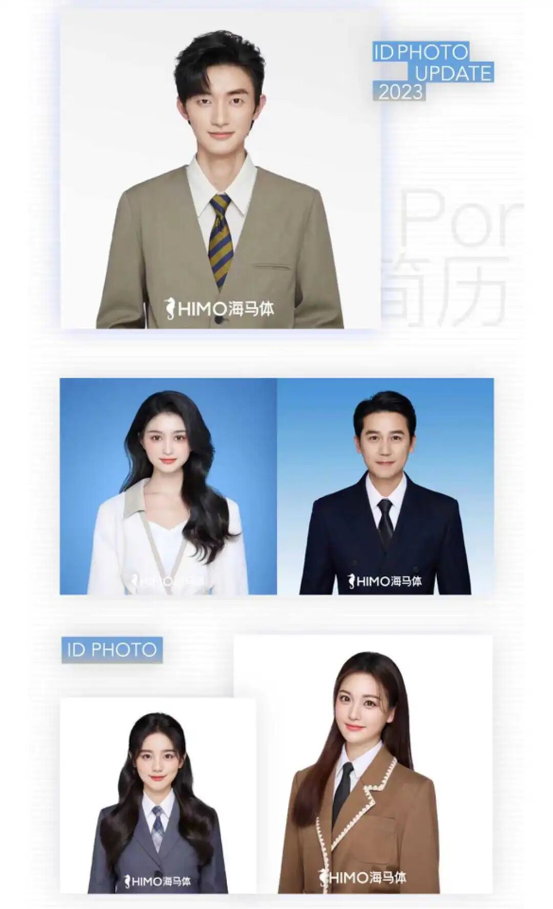 5年后,海马体宣布2023证件照上新。在“经典通用”那一栏,只有修图风格看起来还和之前差不多。妆容上保留了近两年腮红拌饭的美妆趋势,红云直从苹果肌扫到太阳穴,眼眶也跟着红红的。展示发型从中短发偏分、波波头、简单束发转成了高颅顶大波浪长发,也许给HR看看自己的头发还剩多少,也是一种入职实力。背景则多了灰色蓝色的渐变色调,掌控职场人的微妙“氛围感”。