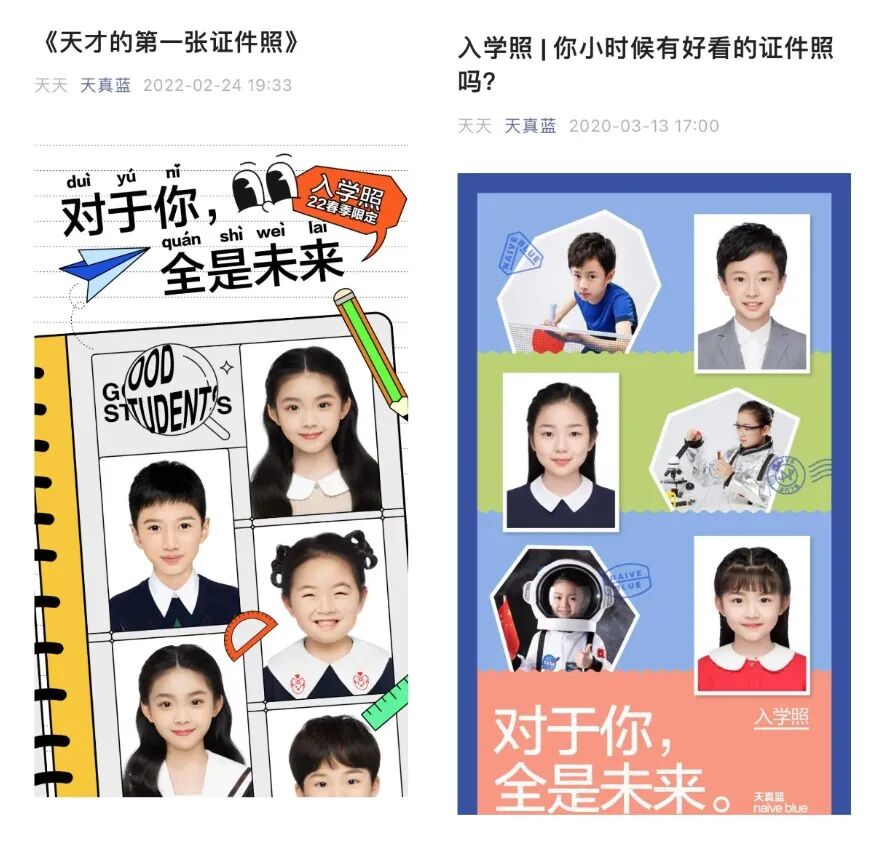 另一方面,照相馆也在尝试营销各种可以用上仪式感证件照的地方。职场胸牌、社交头像、学生证、社团报名表……甚至是幼儿园入学照。或让年轻父母回忆自己小时候入学的缺憾,或将其包装为“天才的第一张证件照”,反正总有很多能让消费者心动的理由。