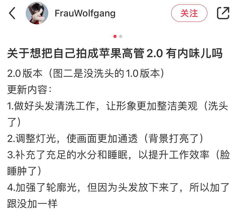 也有设备齐全的网友尝试自己拍摄,意图还原“苹果高管内味”。但评论区探讨,即使拥有打光道具若干,“内味”还是微妙到难以拿捏。一个细节不到位,就会从松弛的苹果高管变成内耗严重的实习生,气势矮一大截。