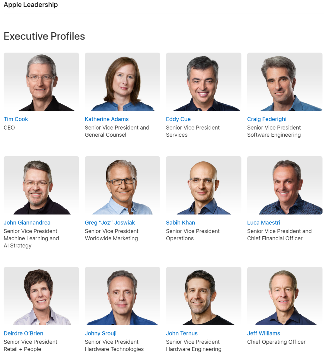 于是主编提了要求,要我周末研究研究,先把自己拍成“苹果高管”,再回来争取把全部门都拍成那样。我的摄影技术连业余都算不上,但也能很快发现这个任务是多么高难——“Apple Leadership”这个网页里,充满了昂贵的细节。
